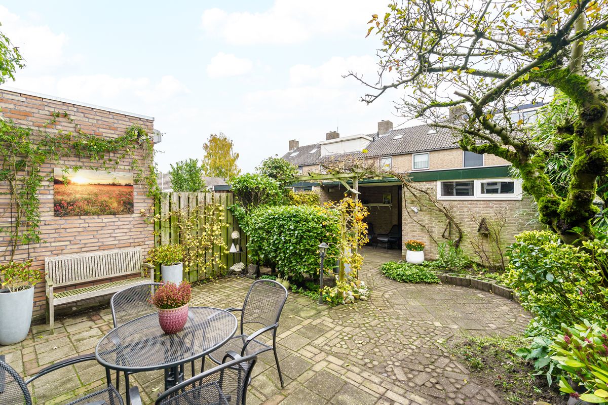 De achtertuin ligt gunstig op het zuidoosten en heeft een fijn terras direct aan het huis. Verder vind je hier een mooie mix van volwassen groen en meerdere zitplekken, waaronder een beschutte overkapping naast de berging achterin de tuin. De tuin is ook bereikbaar via een achterom en beschikt over een (fietsen)berging van circa 9,3 m².