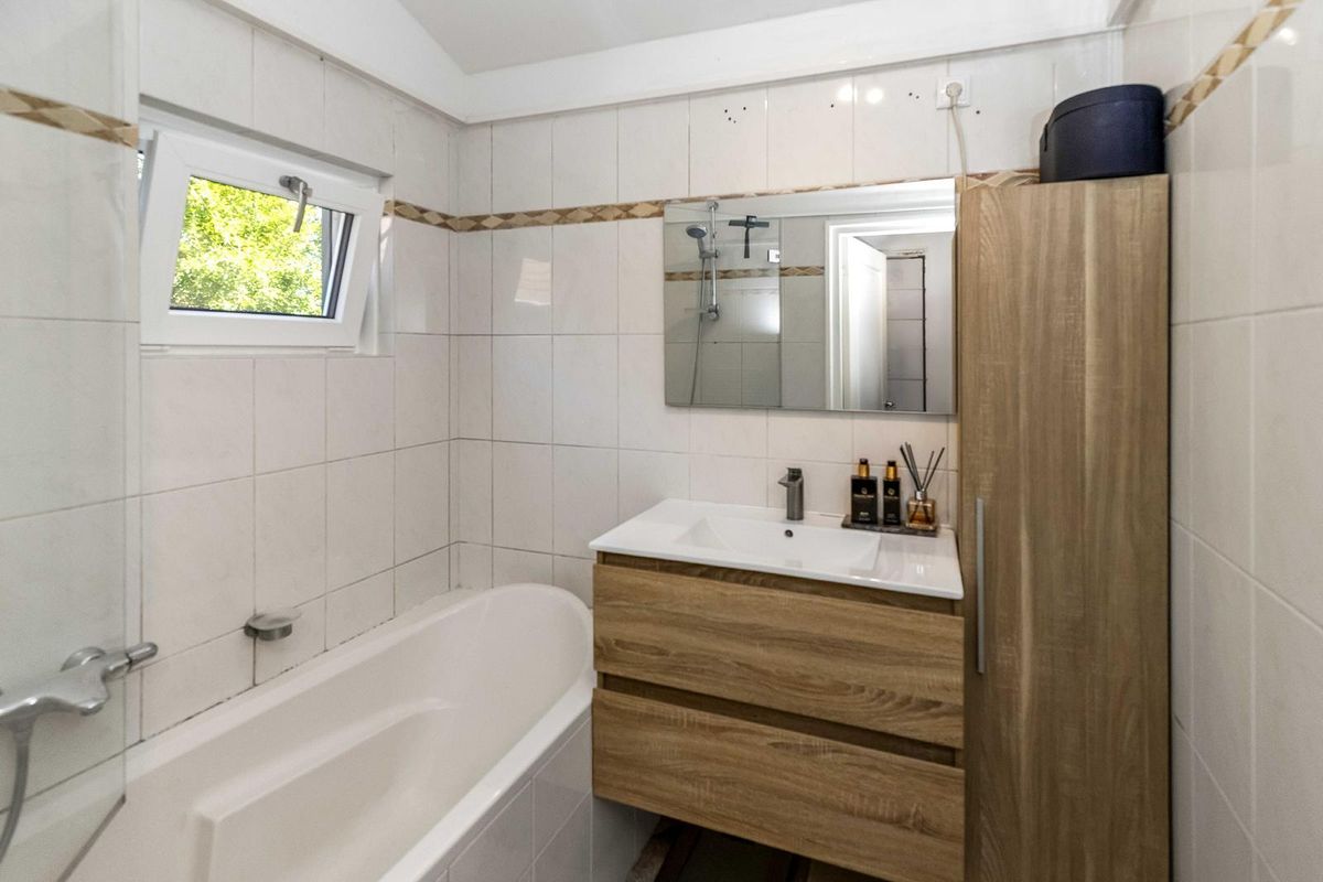 De badkamer is gelegen op de begane grond. De ruimte is voorzien van een ligbad, een wastafel met meubel en is geheel betegeld. Middels mechanische en natuurlijke ventilatie is de ruimte te ventileren.