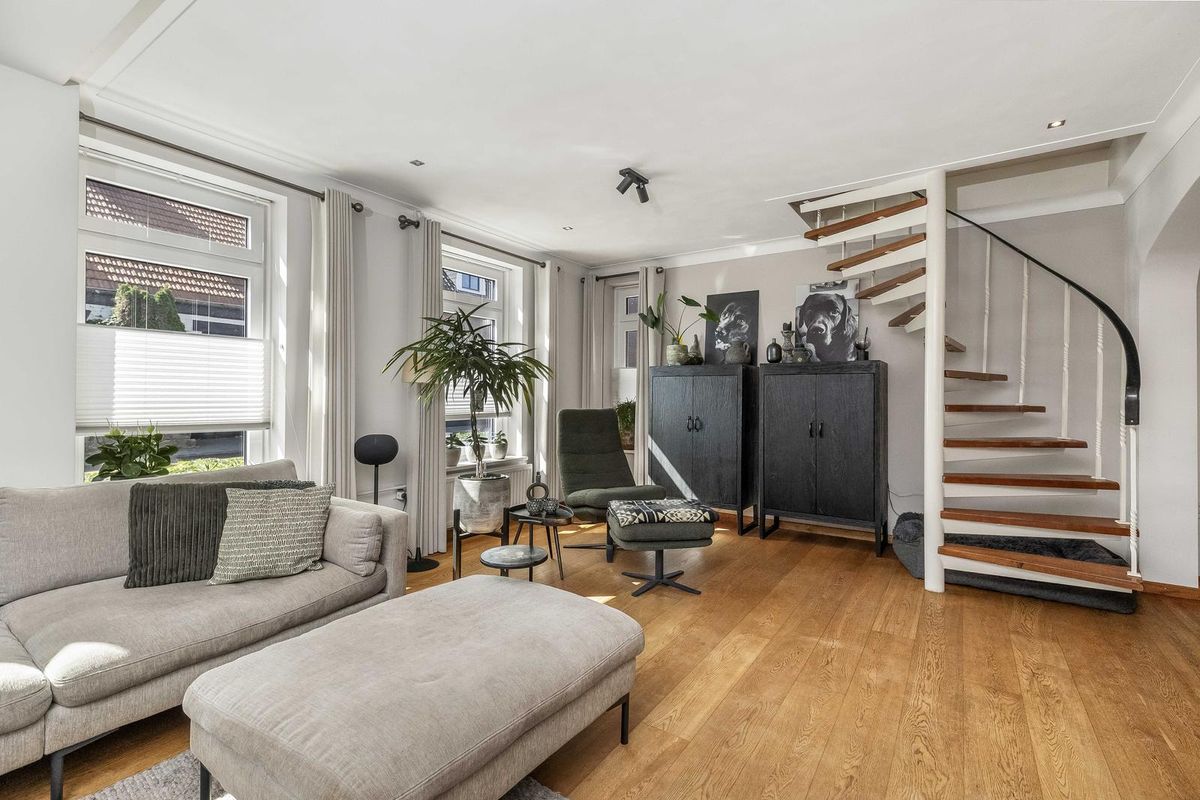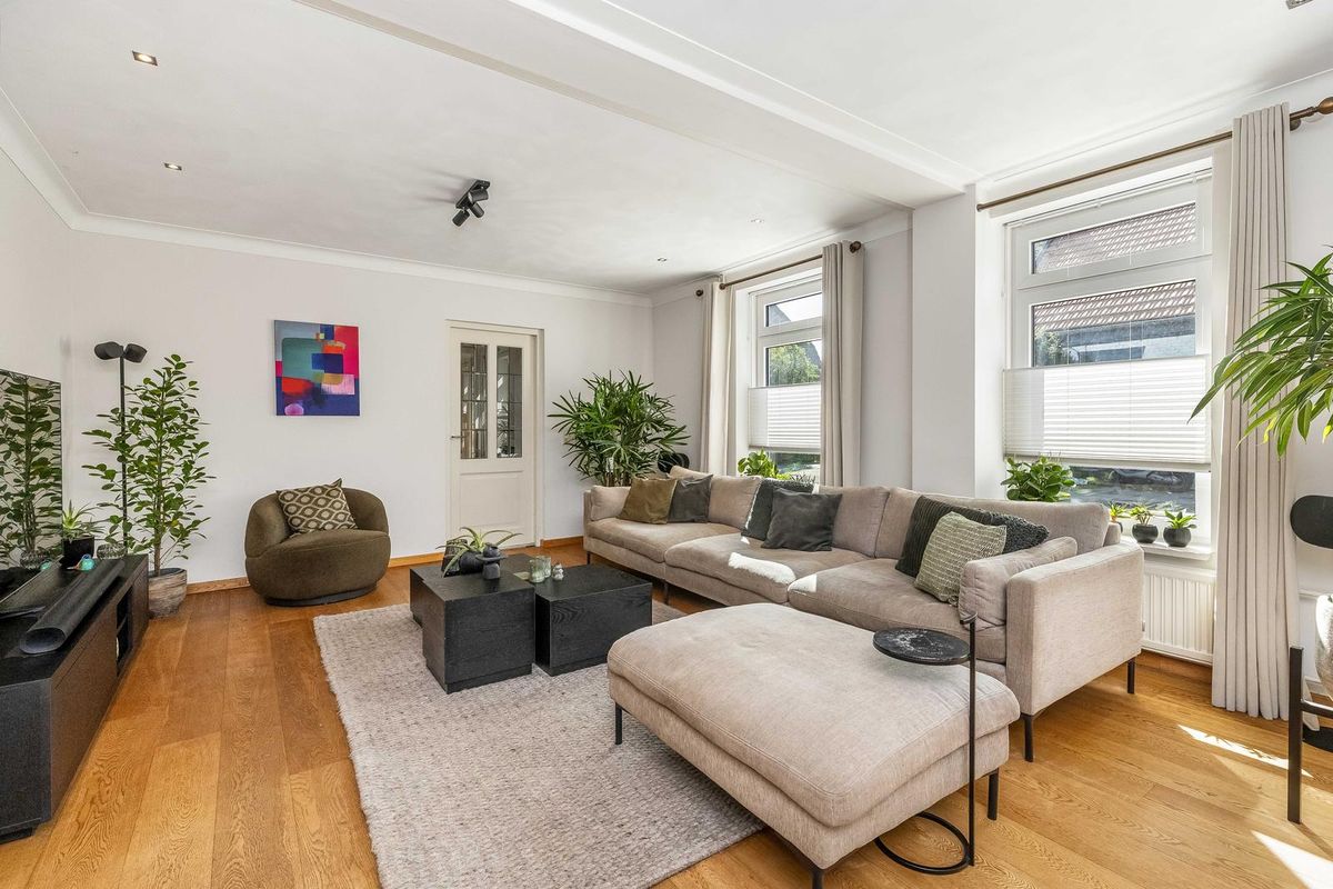 De sfeervolle lichte ruime L-vormige woonkamer is voorzien van een houten vloer met vloerverwarming, gestucte wanden en plafond. Het plafond is tevens voorzien van inbouw spots en sierlijsten