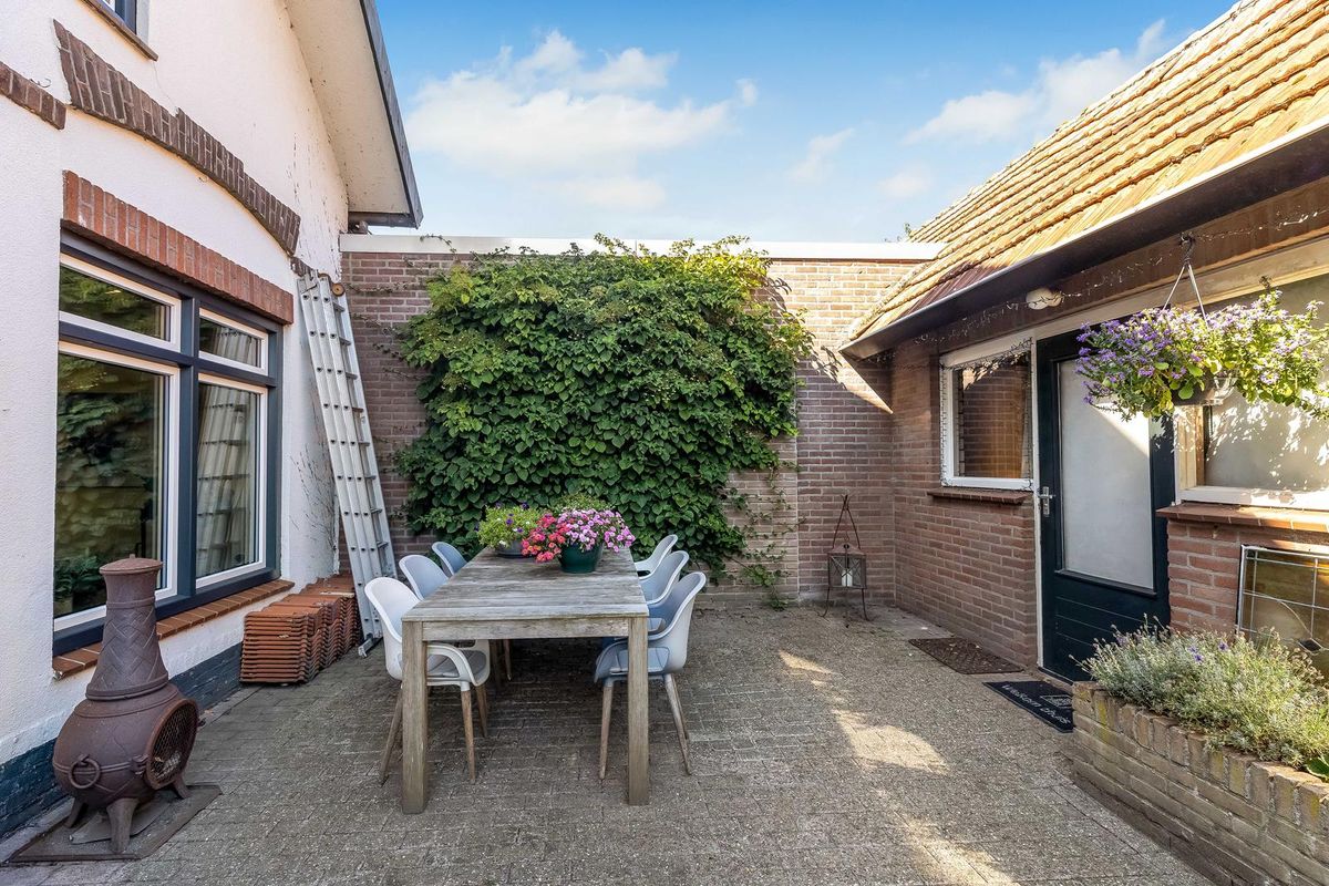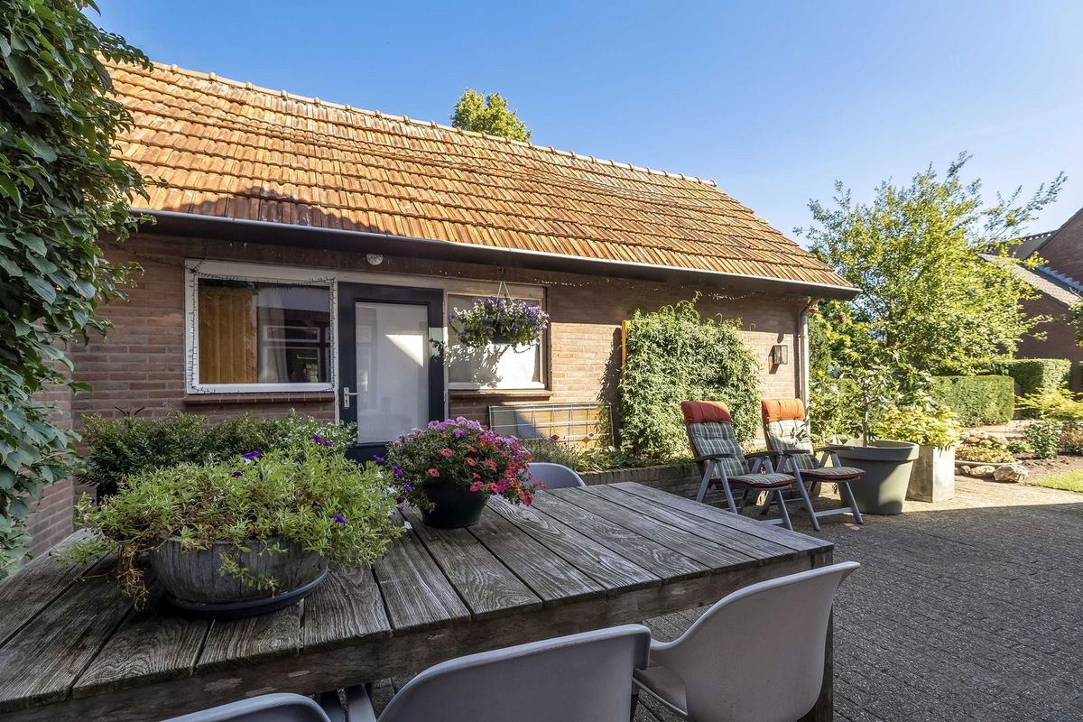 De ruime groene tuin is in een hoek om de woning gelegen. Het terras achter de woning biedt veel privacy en vanuit hier heeft u toegang tot de grote vrijstaande garage. De garage is uitgevoerd in spouw en voorzien van een betonnen vloer en een houten kapconstructie. Hier is ook een aparte onderverdeling van 2 groepen voor elektra en krachtstroom aanwezig. De garage is voorzien van een elektrische kanteldeur.