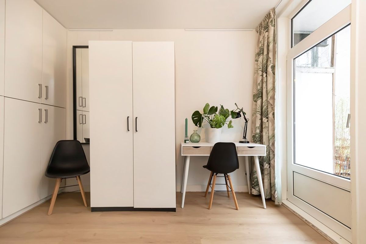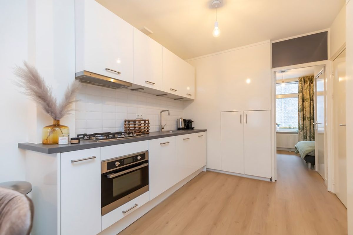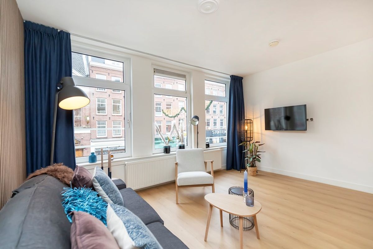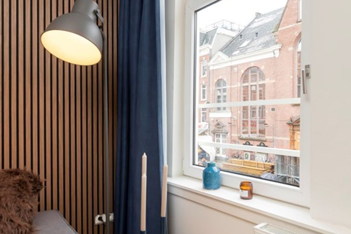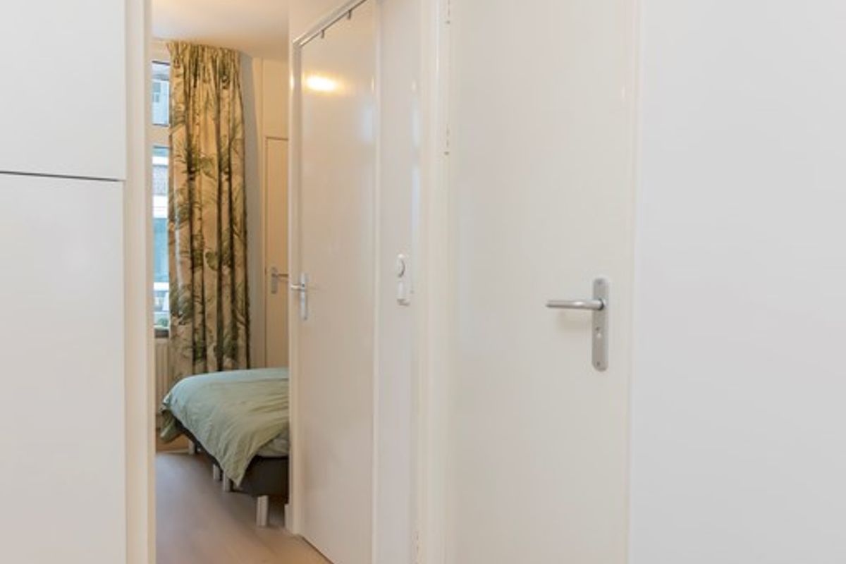 De zithoek is gelegen aan de voorzijde met uitzicht op de Albert Cuypmarkt. Er is veel kastruimte in het appartement.