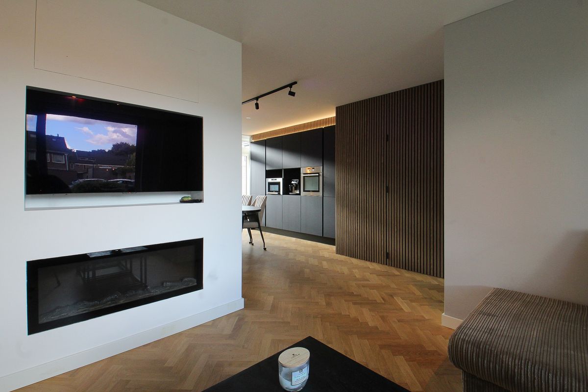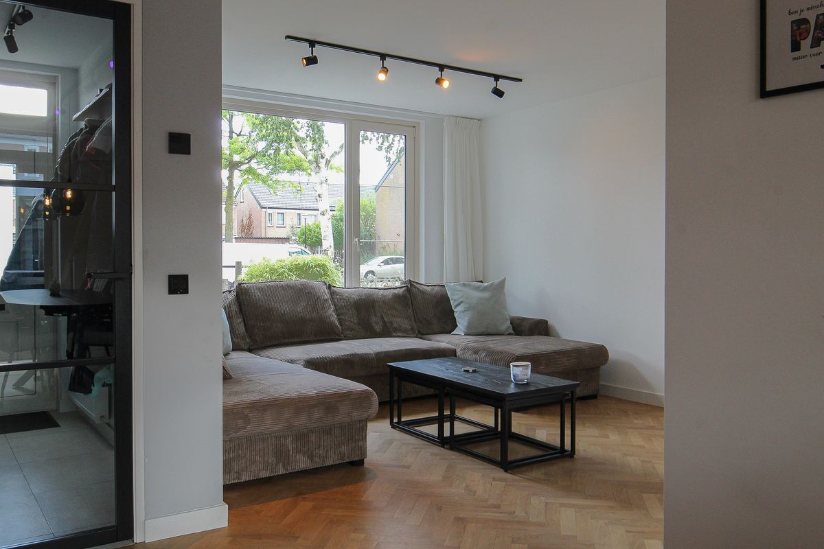 Glazen deur naar de ruime Z-vormige woonkamer met een maatwerk ombouw voor een flatscreen in de zithoek.