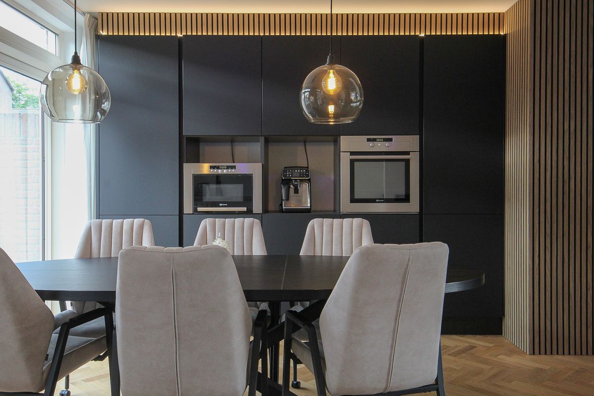 Royaal keukengedeelte als echte eyecatcher met een wandmeubel voor de nodige keukenapparatuur zoals twee koelkasten en twee vriezers én een modern keukenmeubel in hoekopstelling voorzien van een groot werkblad, inductie met afzuiging, vaatwasser en veel lades.