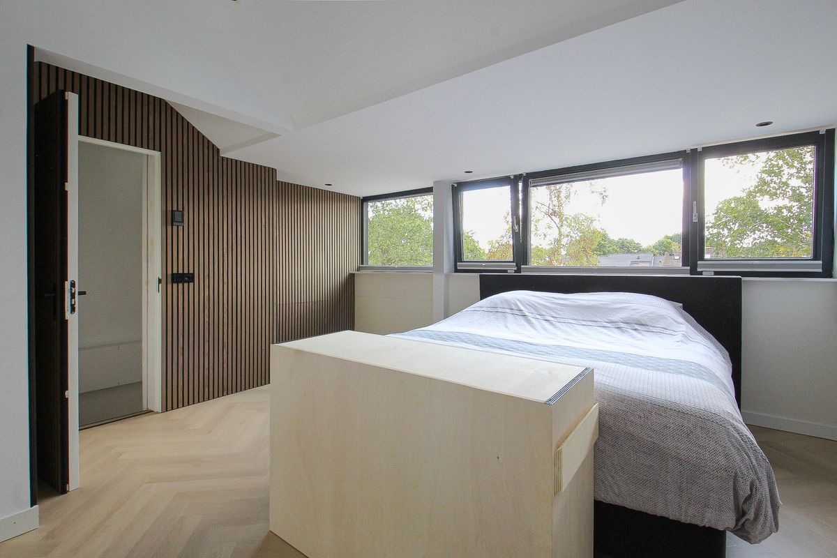 Vaste trap naar de tweede verdieping met een royale vierde (slaap)kamer voorzien van grote dakkapel, airco, bergkasten en berging met de HR-combiketel uit 2025.