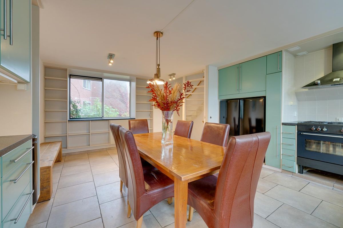 Een trap leidt naar de ruime woonkeuken, het hart van het huis. De keuken is voorzien van een dubbele koelkast, vaatwasser, magnetron, gasfornuis met oven en veel kastruimte. Dankzij de grote ramen aan beide kanten van de woonkeuken is de ruimte heerlijk licht, met uitzicht op zowel de tuin als de straatzijde.
