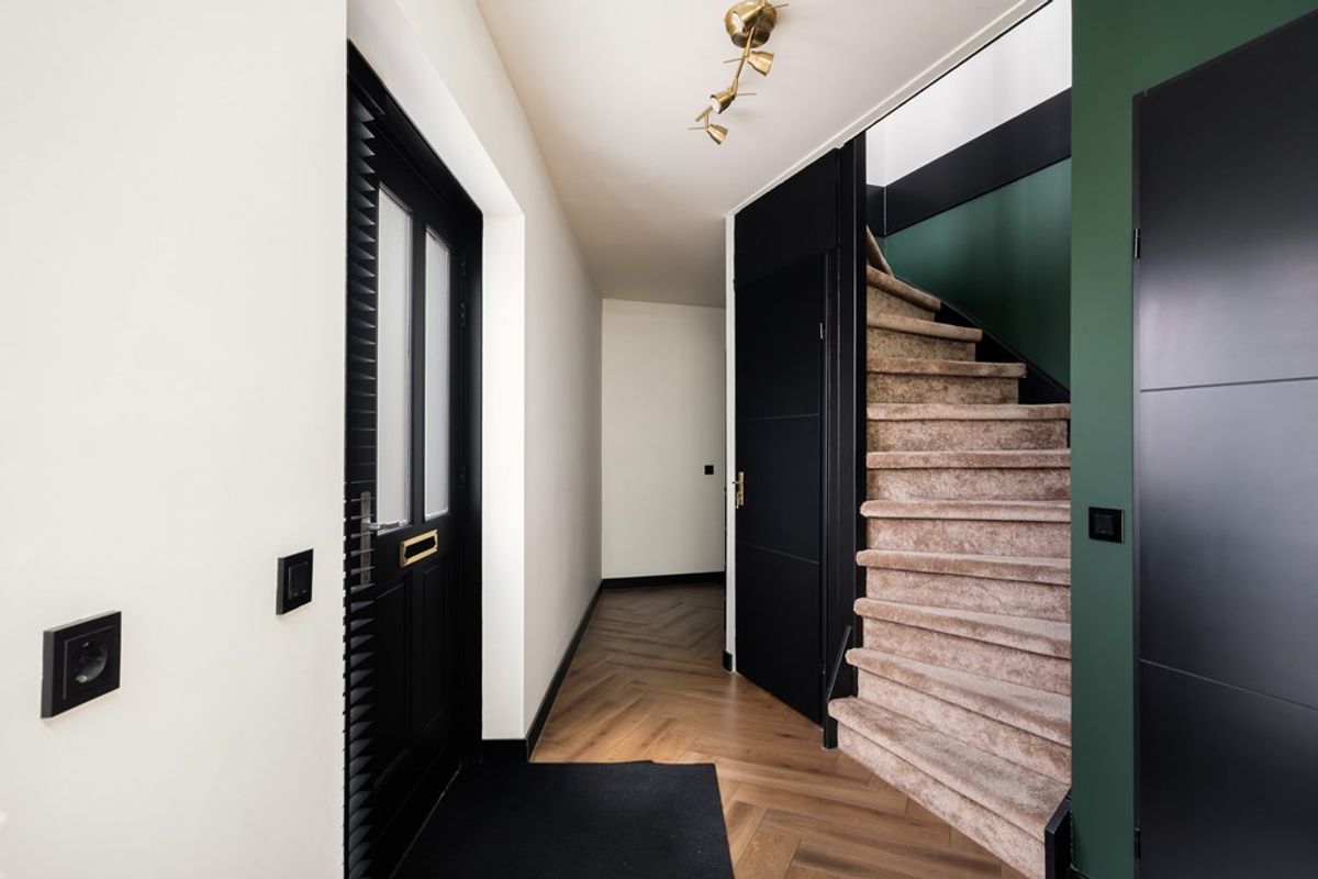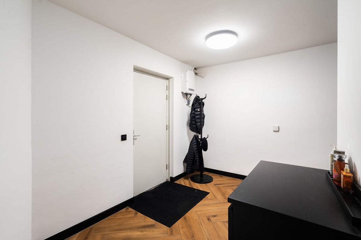 Terug in de hal vind je een modern toilet met fonteintje, een technische ruimte, een praktische berging en de trapopgang naar de verdieping. Vanuit de keuken bereik je bovendien via een aparte trap de derde slaapkamer, die momenteel in gebruik is als bijkeuken/slaapkamer. Ook hier geeft de grote schuifpui toegang tot het royale zonnige dakterras met fraai uitzicht over de groene singel.