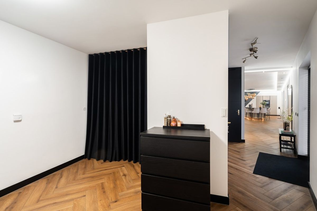 As soon as you enter, the exceptional sense of space stands out. The stately living room of approximately 80 m² features a modern PVC floor with comfortable underfloor heating and a beautiful cine wall with electric fireplace, creating both atmosphere and a luxurious look. Large windows and the wide tinted sliding doors allow daylight to pour in and create a seamless connection to the garden room and the sunny backyard. This is a living space where you can effortlessly relax, work and entertain guests.