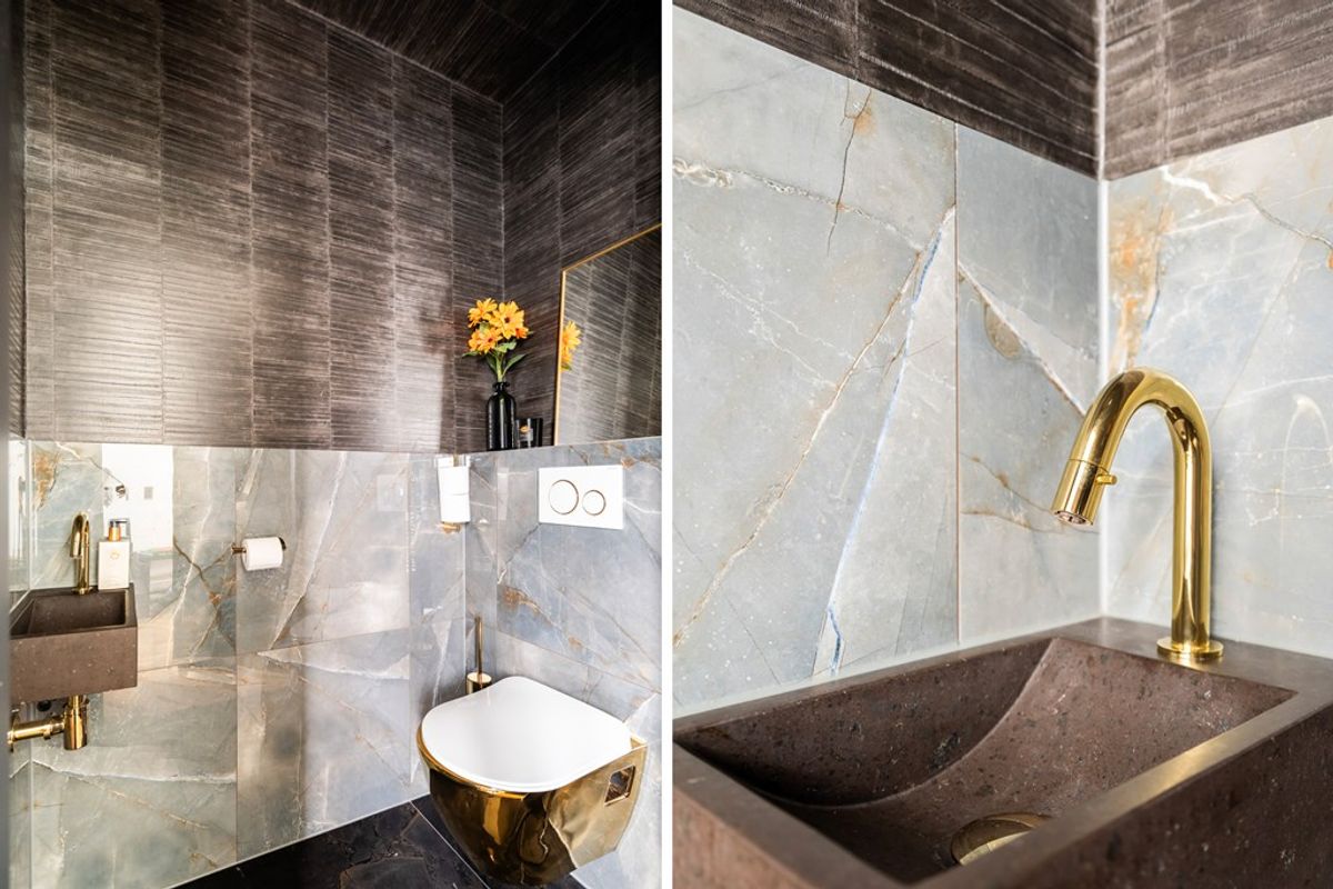 De ensuite badkamer is werkelijk een plaatje en uitgevoerd met chique gouden accenten. Hier beschik je over een vrijstaand ligbad, een ruime inloopdouche met rainshower, een dubbele wastafel en een zwevend toilet. Een privé wellnessruimte in eigen huis.