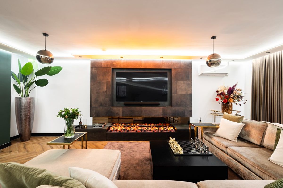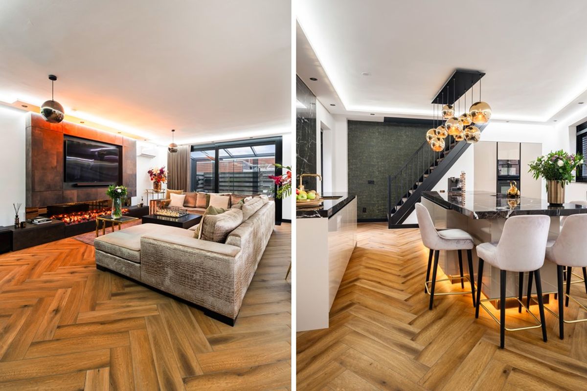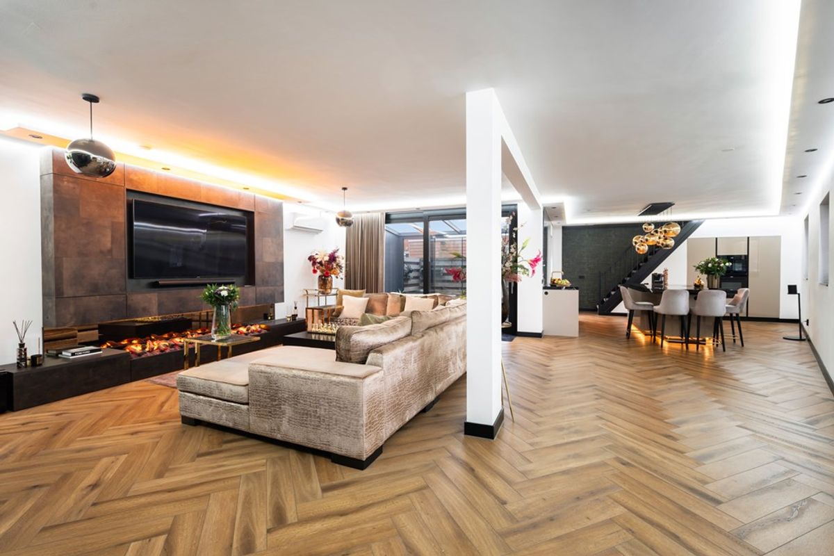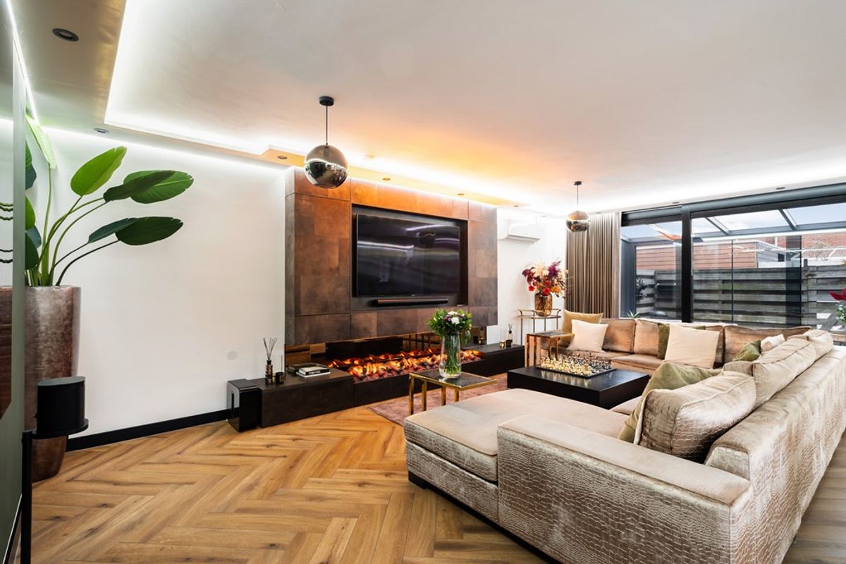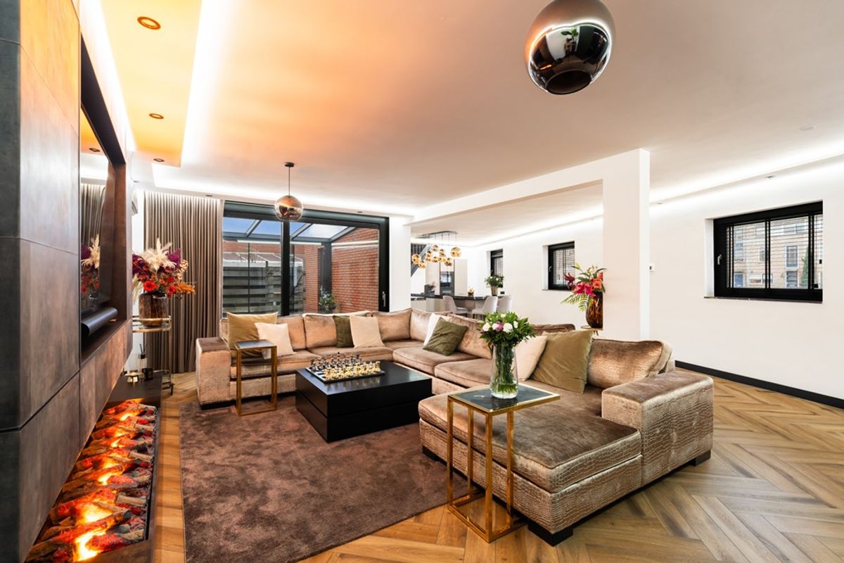 Zodra je binnenkomt valt de enorme leefruimte direct op. De vorstelijke living van circa 80 m² is voorzien van een moderne pvc-vloer met comfortabele vloerverwarming en een prachtige cine wall met elektrische haard die zorgt voor sfeer én een luxe uitstraling. Grote raampartijen en de brede, geblindeerde schuifpui laten het daglicht rijkelijk binnenstromen en creëren een mooie verbinding met de serre en de zonnige achtertuin. Dit is een leefruimte waar je moeiteloos ontspant, werkt en gasten ontvangt.