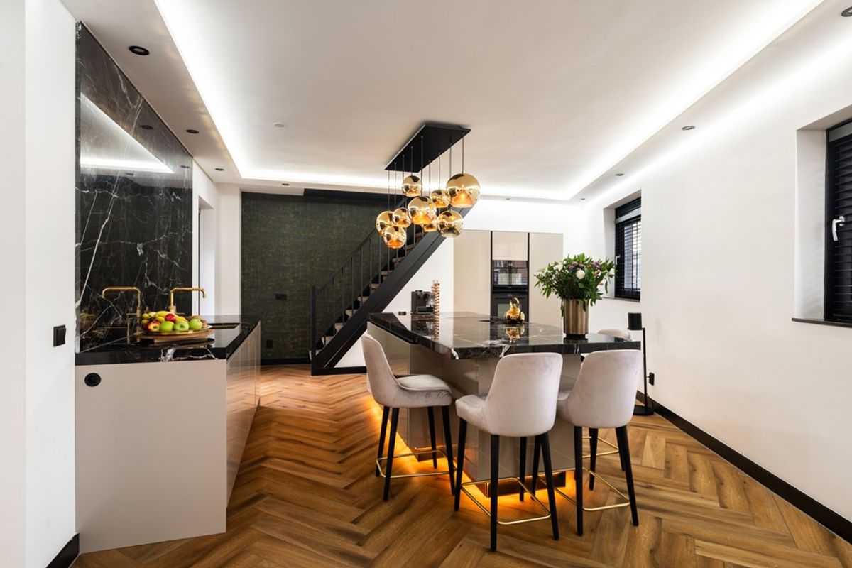 The luxury kitchen is a true eye-catcher and the heart of the home. The playfully positioned cooking island with bar area invites long evenings of dining and social cooking. The kitchen is finished in taupe high-gloss cabinetry with soft-close drawers and a stylish marble-look countertop.