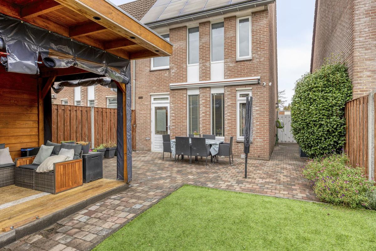 De achtertuin is een plek om van te genieten! Direct aan de woning is een betegeld terras, ideaal voor een lounge- of eethoek. Verder vind je een stukje gras, groene borders en een houten overkapping met berging. En er is meer: de berging is omgetoverd tot een fraaie praktijkruimte, nu in gebruik als beautysalon. Via de zijkant van de woning is de tuin ook achterom bereikbaar.