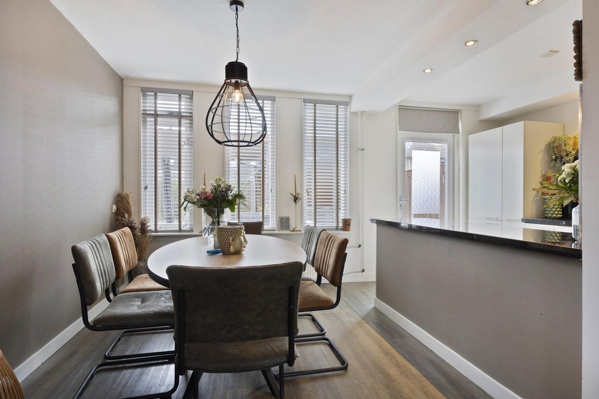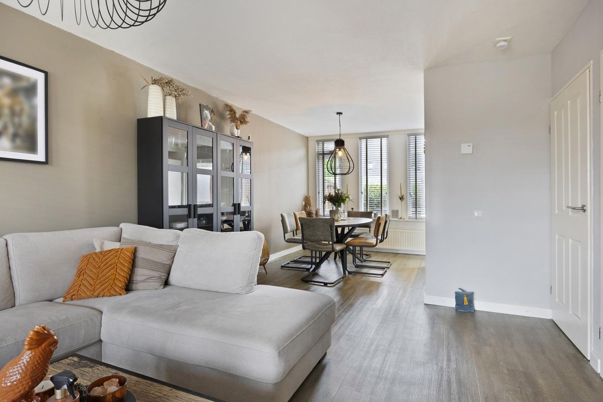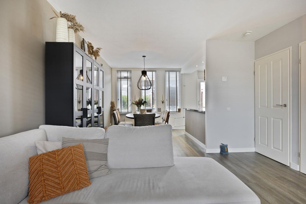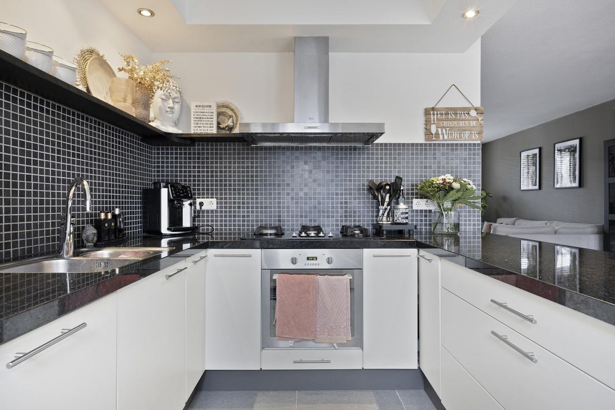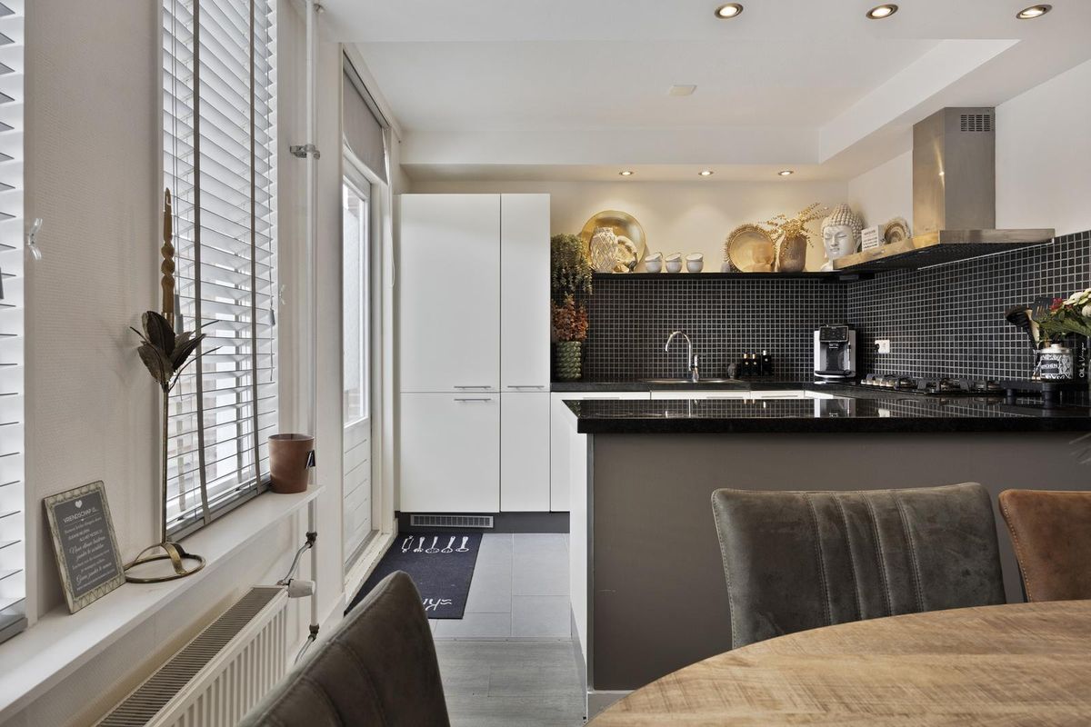 De woonkamer voelt fris en ruim aan. Aan de voorzijde bevindt zich het zitgedeelte, perfect voor een gezellige hoekbank. Aan de achterzijde ligt de eethoek met aansluitend de open keuken. Dankzij de praktische indeling is er ook ruimte voor een kast tussen het zit- en eetgedeelte. De laminaatvloer zorgt voor een nette basis. De moderne keuken in U-opstelling is een echte eyecatcher: witte frontjes, een zwart blad en een strak betegelde achterwand in zwart geblokt patroon. Uiteraard is de keuken voorzien van alle apparatuur die je nodig hebt: kookplaat, afzuigkap, combi-oven, koelkast en vriezer. Via de keuken stap je zo de achtertuin in. De trap naar boven zit centraal in de woonkamer en is afgesloten met een deur. Extra opbergruimte vind je in de handige trapkast.