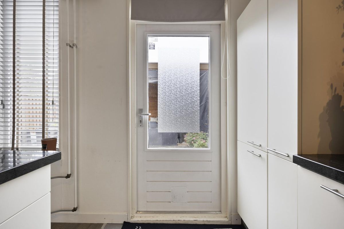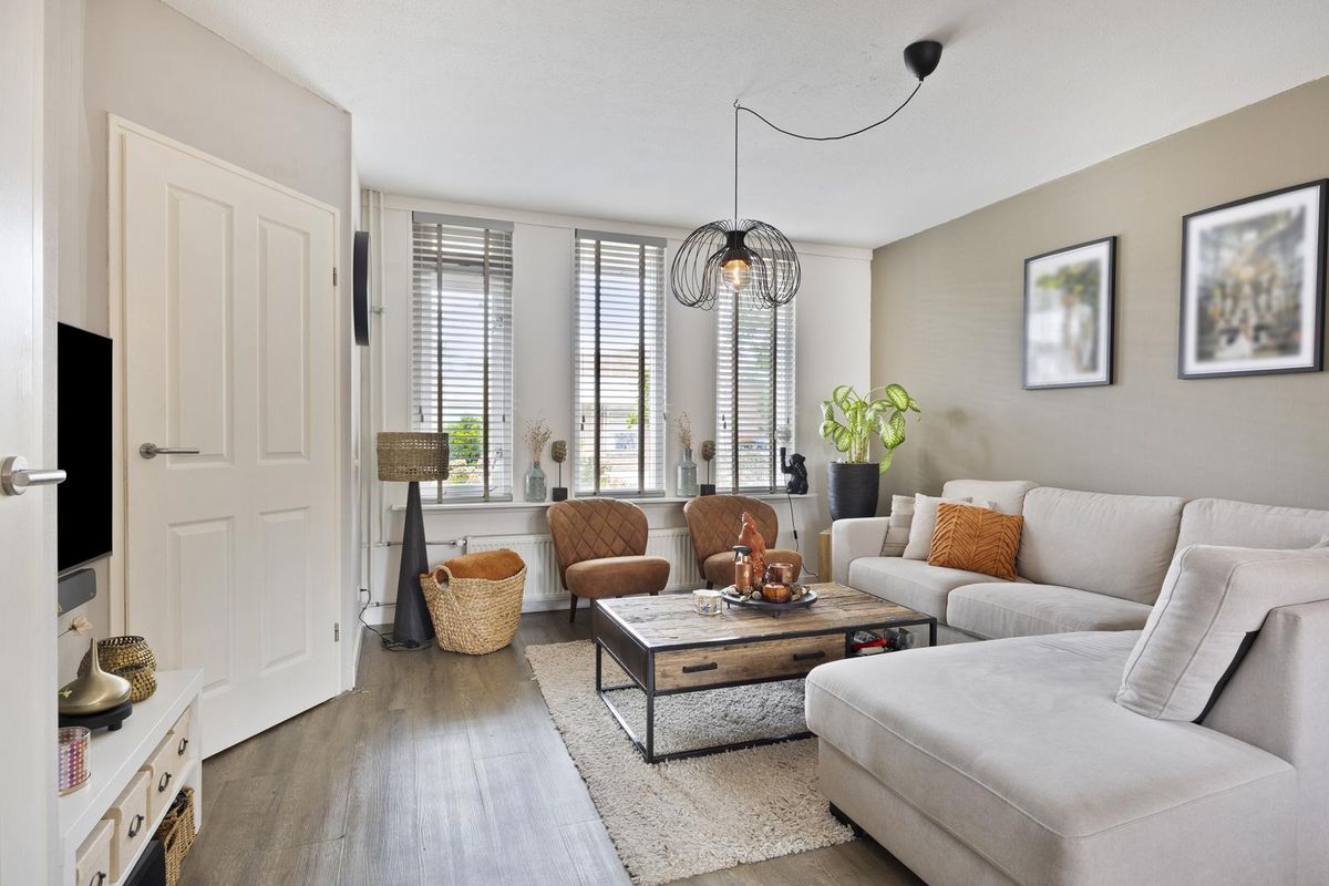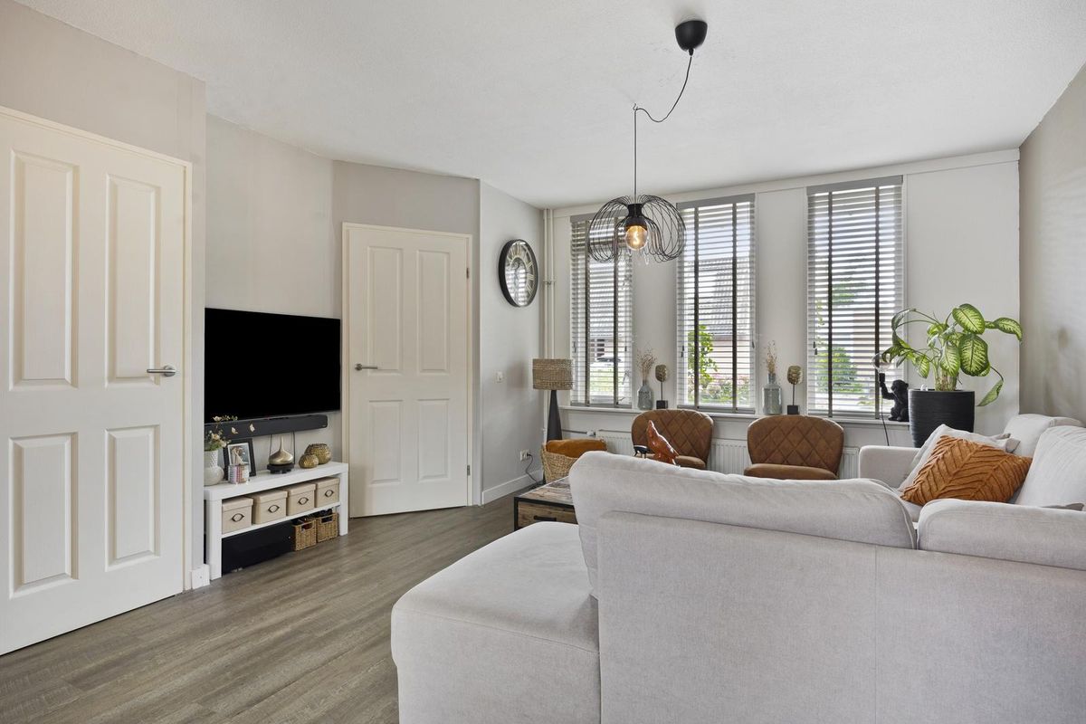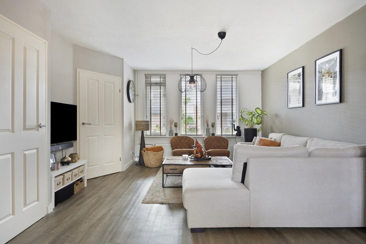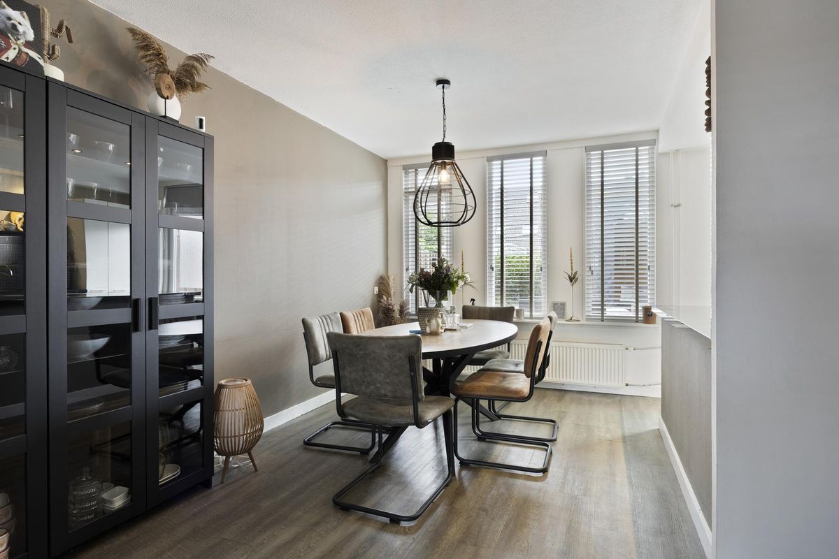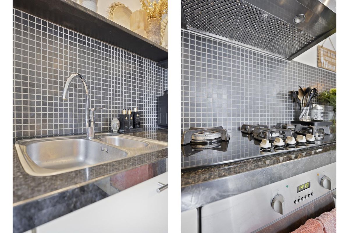De woonkamer voelt fris en ruim aan. Aan de voorzijde bevindt zich het zitgedeelte, perfect voor een gezellige hoekbank. Aan de achterzijde ligt de eethoek met aansluitend de open keuken. Dankzij de praktische indeling is er ook ruimte voor een kast tussen het zit- en eetgedeelte. De laminaatvloer zorgt voor een nette basis. De moderne keuken in U-opstelling is een echte eyecatcher: witte frontjes, een zwart blad en een strak betegelde achterwand in zwart geblokt patroon. Uiteraard is de keuken voorzien van alle apparatuur die je nodig hebt: kookplaat, afzuigkap, combi-oven, koelkast en vriezer. Via de keuken stap je zo de achtertuin in. De trap naar boven zit centraal in de woonkamer en is afgesloten met een deur. Extra opbergruimte vind je in de handige trapkast.