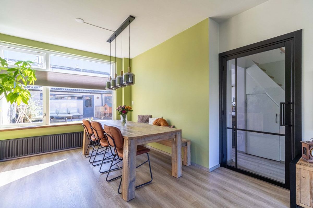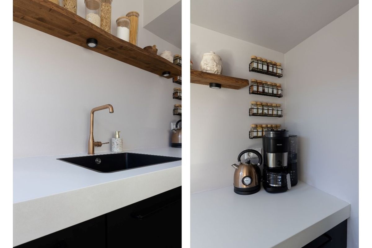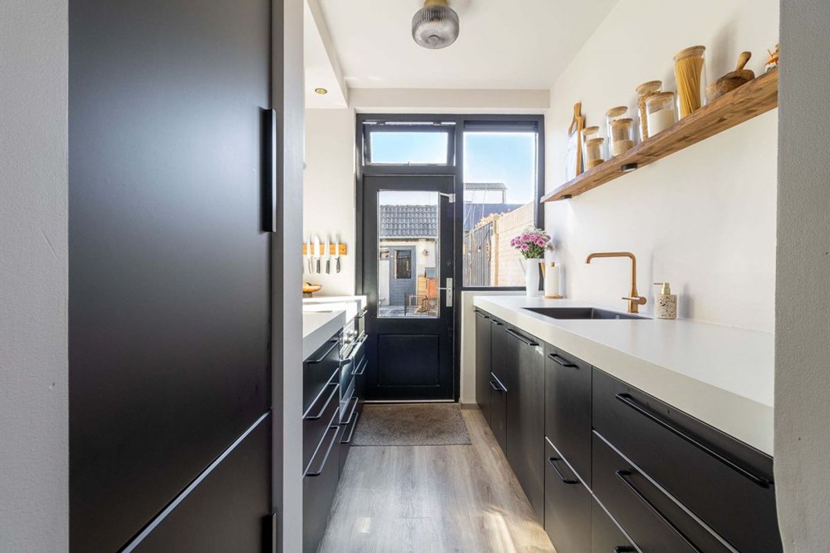Aan de achterzijde bevindt zich de keuken, opgesteld in een praktische rechte opstelling en voorzien van diverse inbouwapparatuur. Vanuit de keuken is er directe toegang tot de achtertuin.