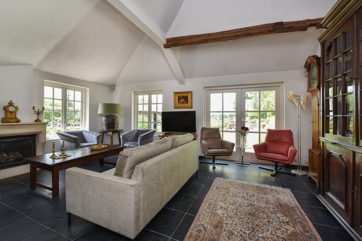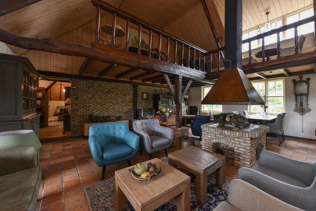 De sfeervolle woonkamer is een indrukwekkende ruimte met een vide en opvallende open haard. Vanuit de woonkamer loop je zo het terras achter de woning op, waardoor binnen en buiten naadloos in elkaar overgaan.