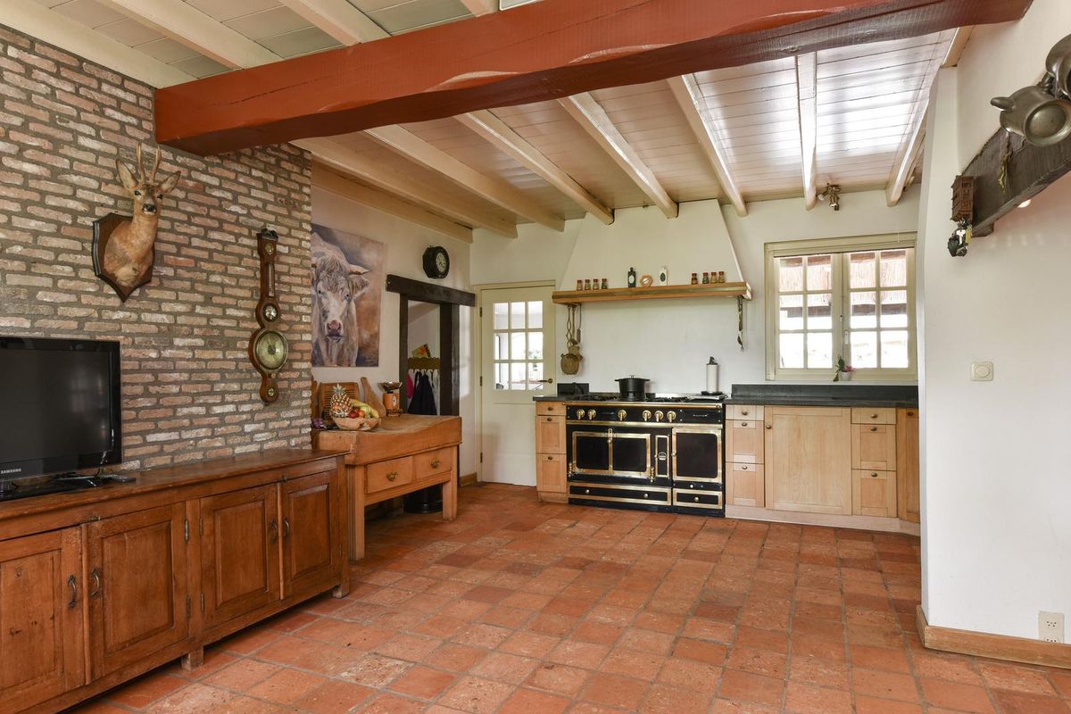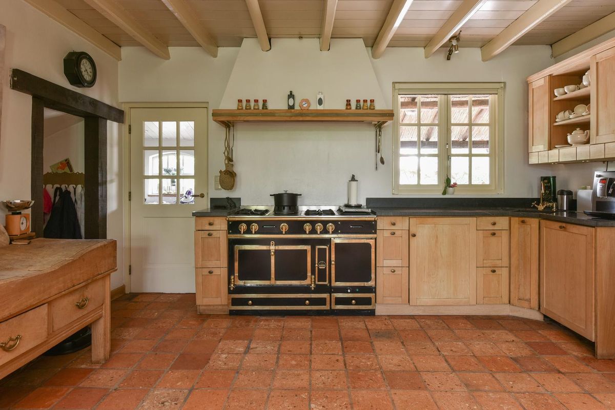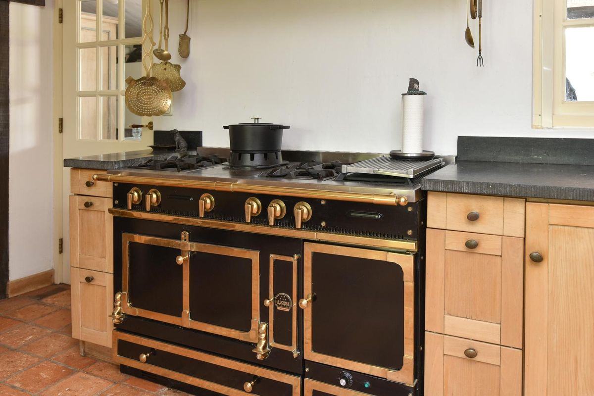 De woonkeuken is uitgerust met een hoekopstelling met diverse onder- en bovenkasten, een natuurstenen werkblad, een natuursteen spoelbak, een vaatwasmachine, een koelkast, een stijlvol La Cornue gasfornuis en een afzuigkap. De originele schouw voegt extra karakter toe aan deze ruimte. Vanuit de keuken is de kelder bereikbaar, die extra bergruimte biedt voor proviand.