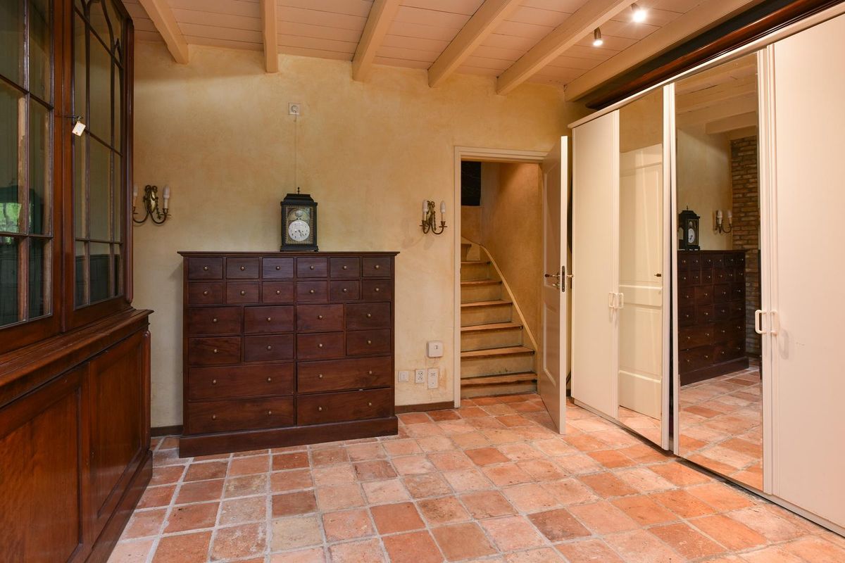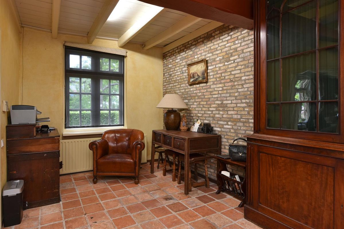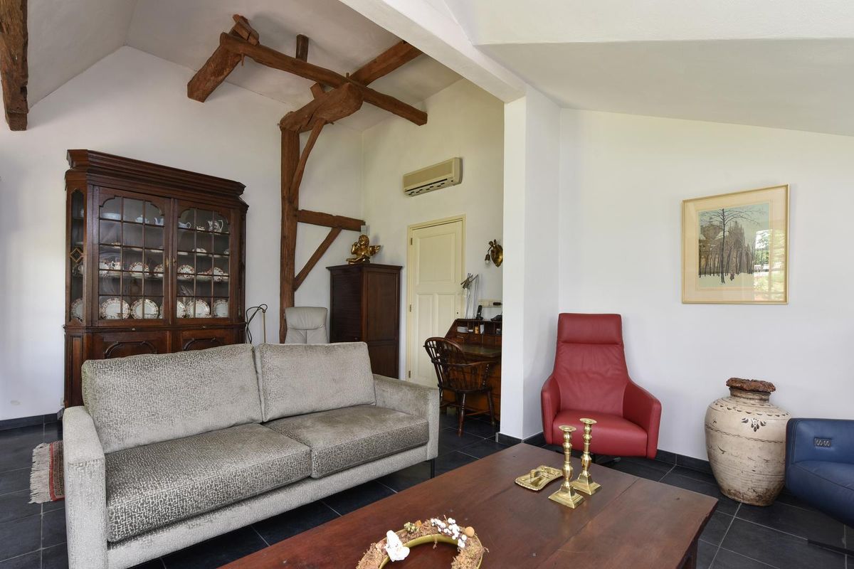 Vanuit de woonkamer is het tussenportaal bereikbaar. Dit portaal geeft toegang tot de tuinkamer, welke is voorzien van hoge plafonds, grote raampartijen, openslaande deuren naar het terras, een hardstenen vloer, airconditioning en een gashaard.