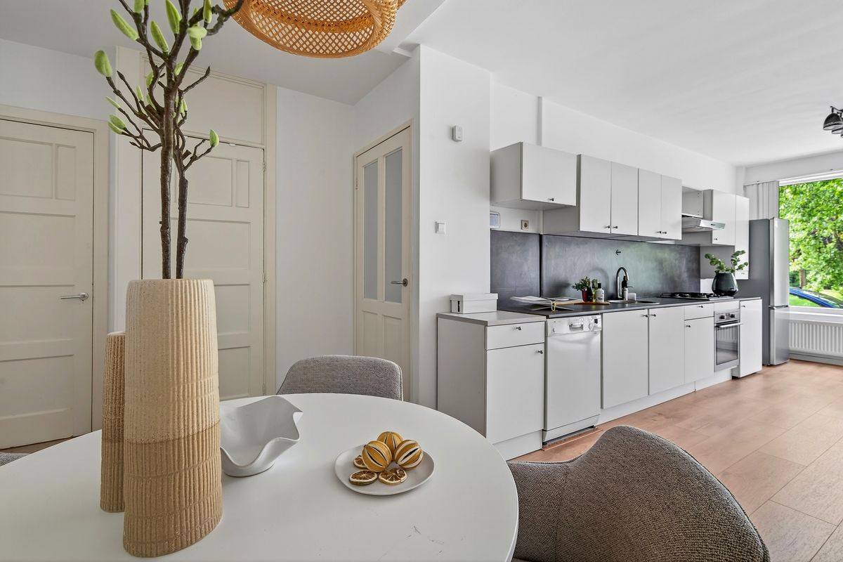 Loop je iets verder door, dan kom je bij de keuken met aangrenzende eetkamer. Een fijne plek voor een gezellige eettafel, waar je samen kunt eten of werken. Vanuit de eetkamer is er bovendien toegang tot een tweede badkamer.