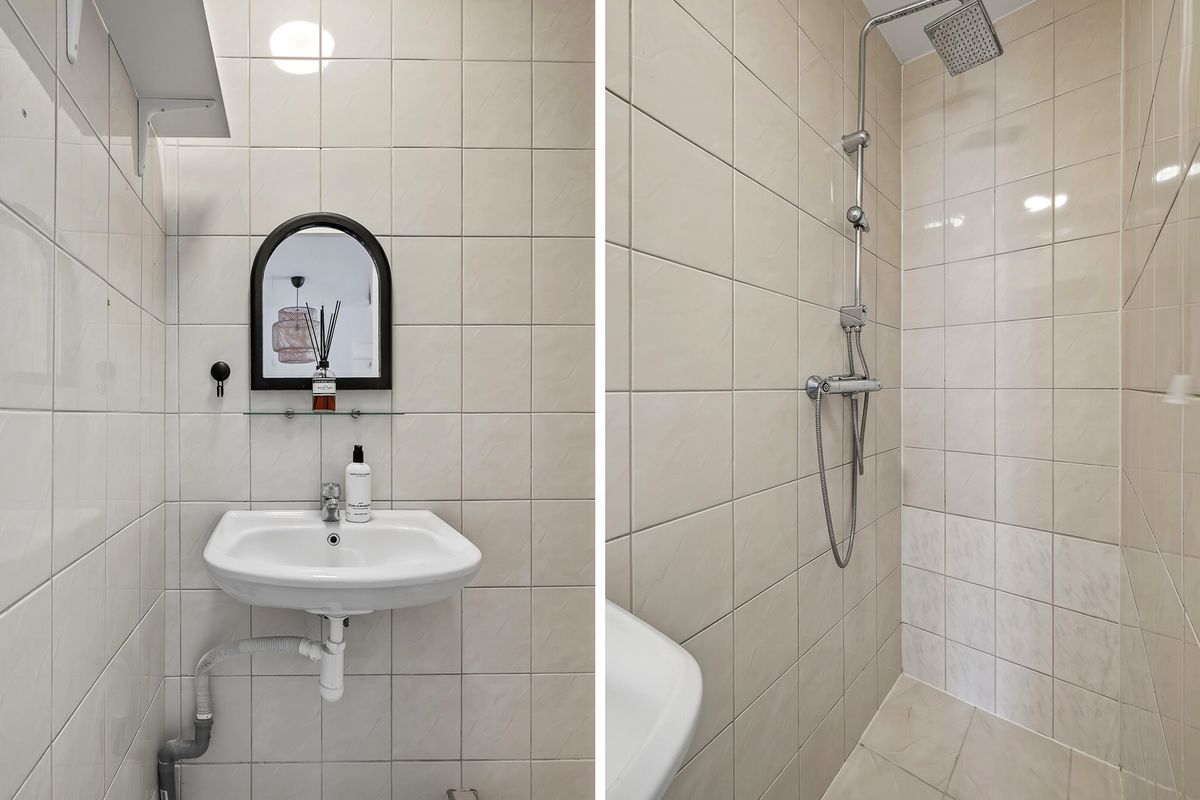 A little further along, you reach the kitchen with an adjoining dining room—a perfect spot for a cozy dining table where you can eat or work together. From the dining room, there is also access to a second bathroom.