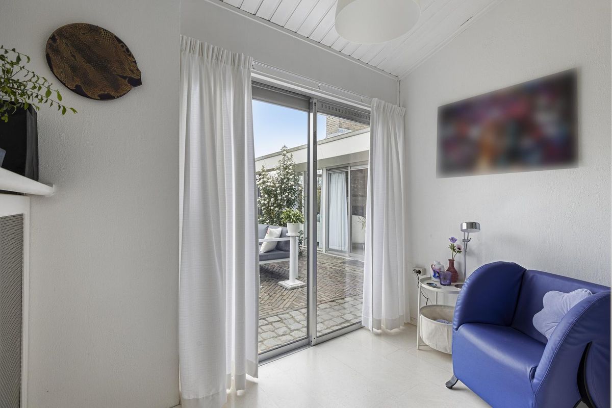 De studeerkamer heeft een schuifpui naar buiten, wat zorgt voor veel lichtinval en direct toegang tot de tuin.