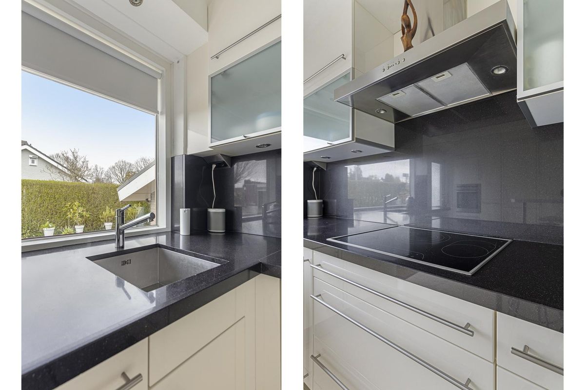 De keuken, bereikbaar vanuit zowel de woonkamer als via de zijdeur, is modern en compleet uitgerust.