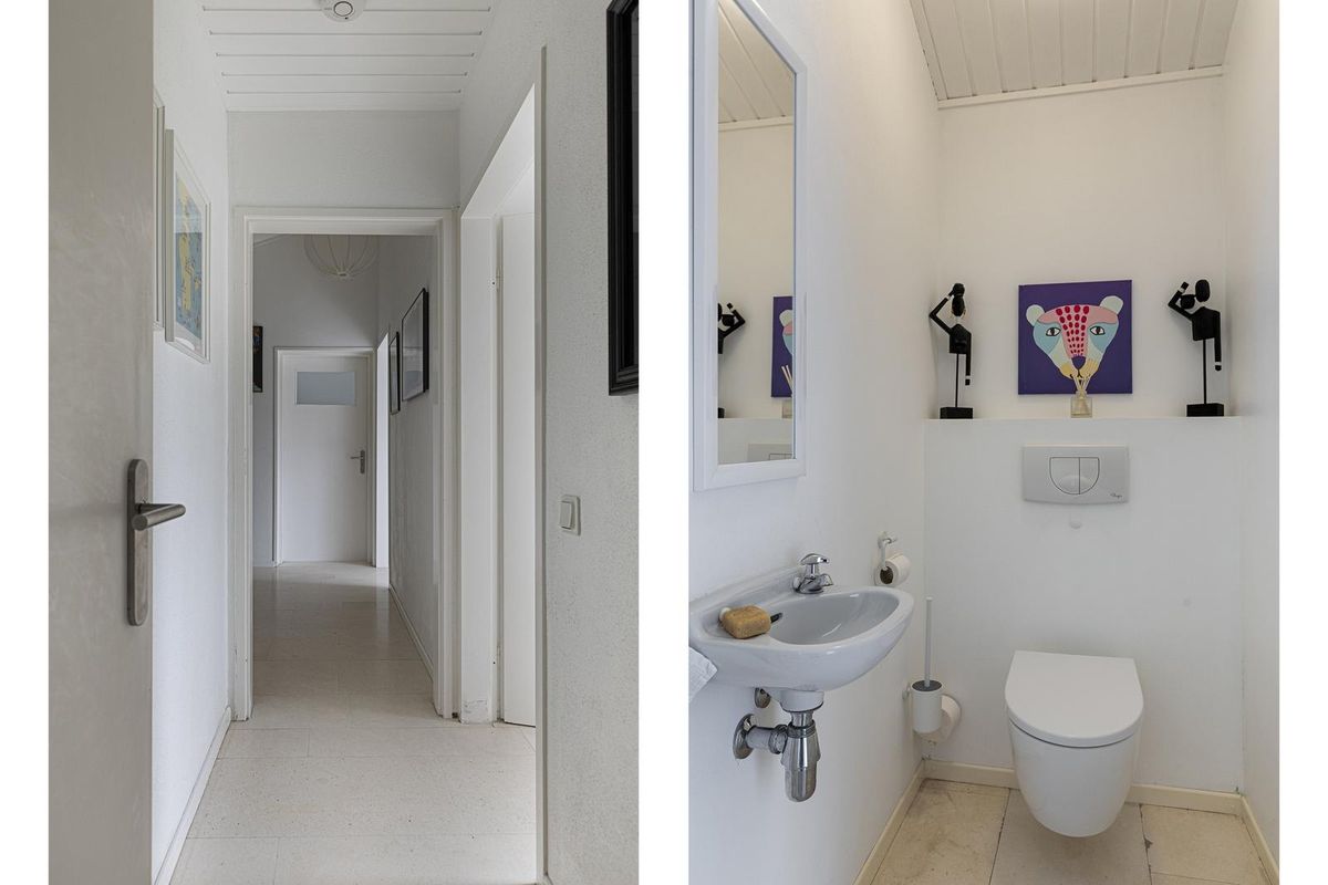 Bij binnenkomst tref je direct de wastafel. Via een kleine trap bereik je het verlaagde gedeelte met ligbad, inloopdouche en toilet. Een echte wellnesservaring. Een ingebouwde kastenwand zorgt voor veel opbergruimte, waarvan één kast toegang biedt tot de praktische bijkeuken met witgoedaansluitingen en extra koelkastruimte.