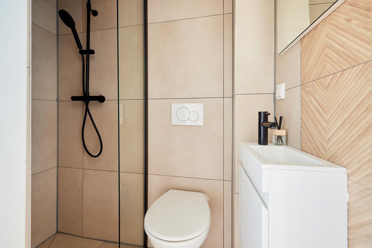 Bij binnenkomst word je meteen verrast door de hoogwaardige afwerking: een stijlvolle visgraatvloer, een moderne open keuken met inbouwapparatuur en een luxe badkamer met douche, wastafel en toilet. Dankzij de slimme indeling, de hoge plafonds en de grote ramen voelt de ruimte verrassend licht en ruim aan. Hierdoor was het dus ook mogelijk om een slaapvide te creëren. De ideale woonruimte voor starters, young professionals of als pied-à-terre in deze gewilde buurt!