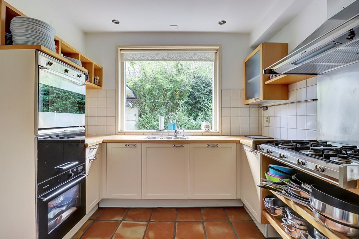 De keuken (ca. 9,5 m²) is uitgerust met een spoelbak, gaskookplaat, afzuigkap, oven en vaatwasser.