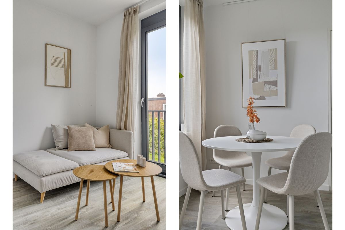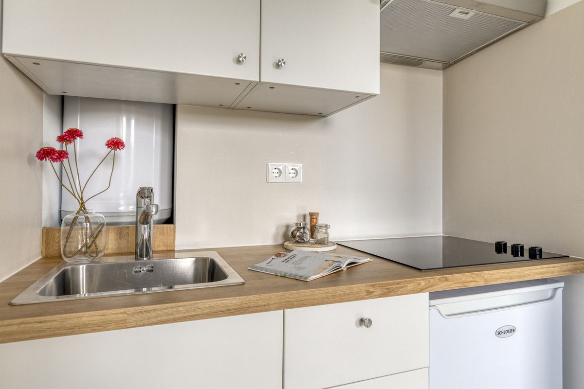 Bij binnenkomst valt meteen de lichte en open sfeer op. De studio is slim ingedeeld, waardoor de beschikbare ruimte optimaal wordt benut. De woonruimte heeft een prettig lichtinval en biedt toegang tot een Frans balkon, ideaal om de deuren open te zetten en een frisse bries binnen te laten.