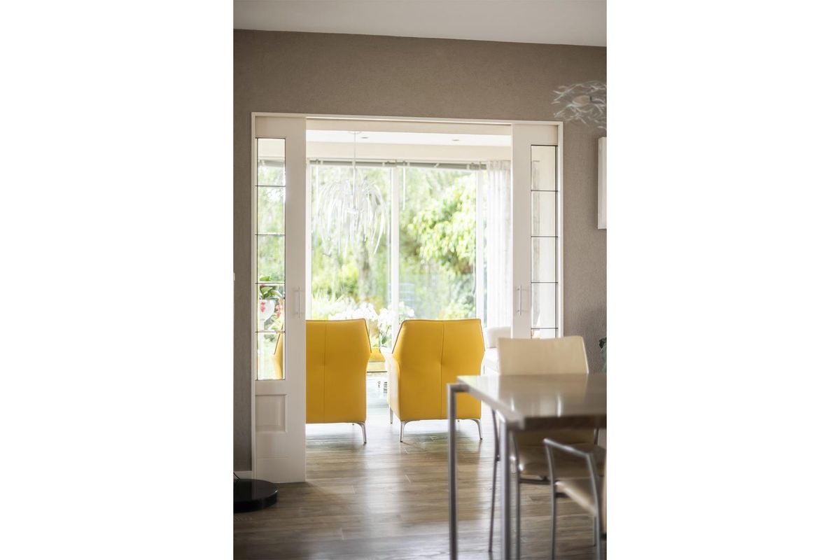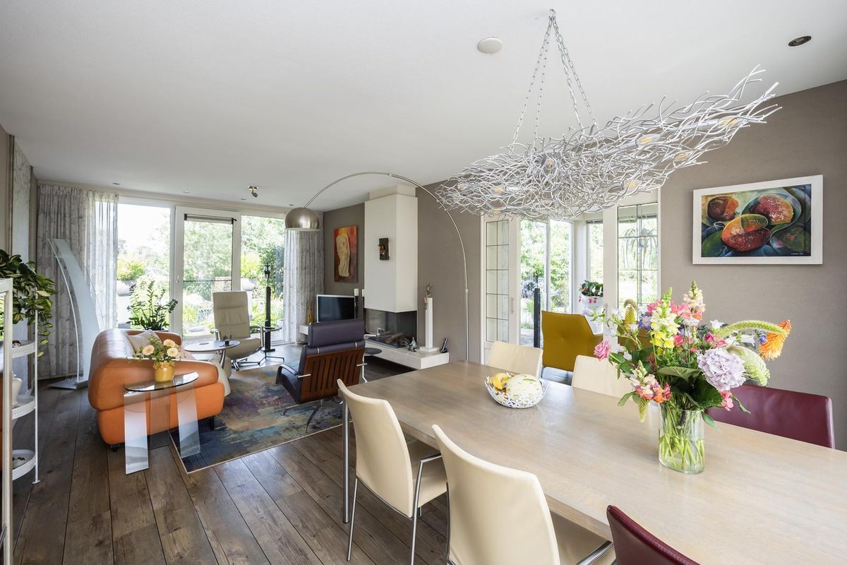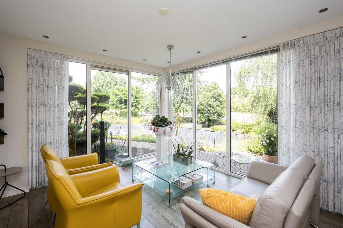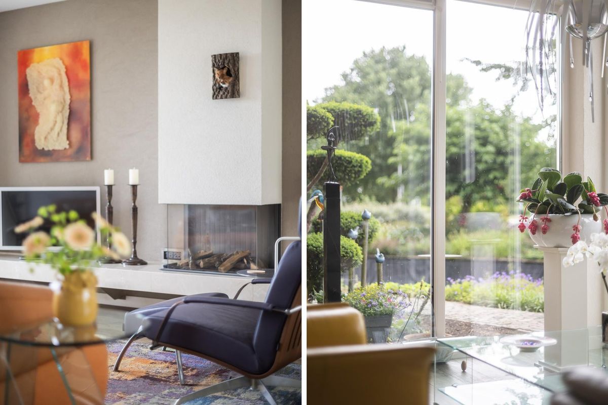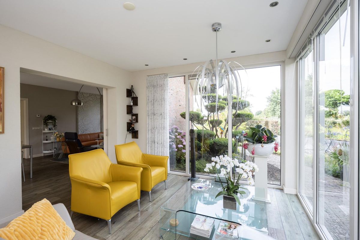 De woonkamer sluit direct aan op de serre, die later is aangebouwd. Dankzij de grote raampartijen is dit een heerlijke plek om in elk seizoen te genieten van de omgeving – van de eerste voorjaarszon tot lange zomeravonden of juist knusse winterdagen.