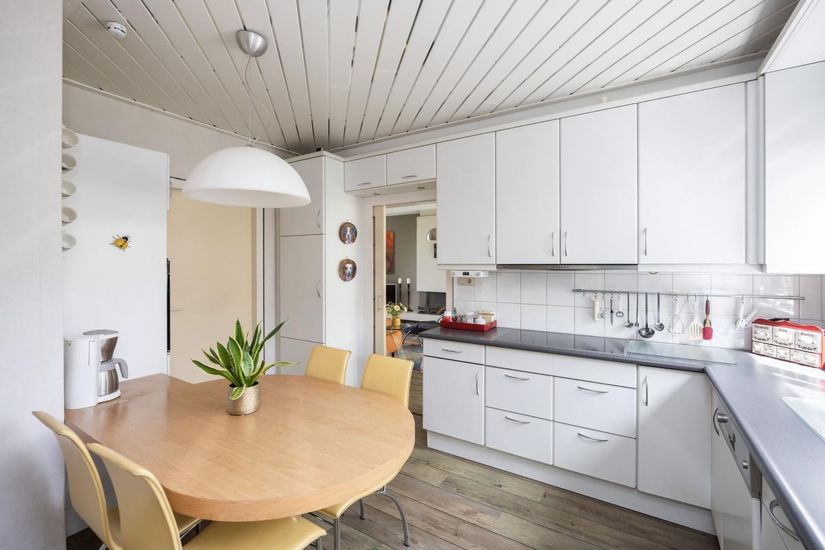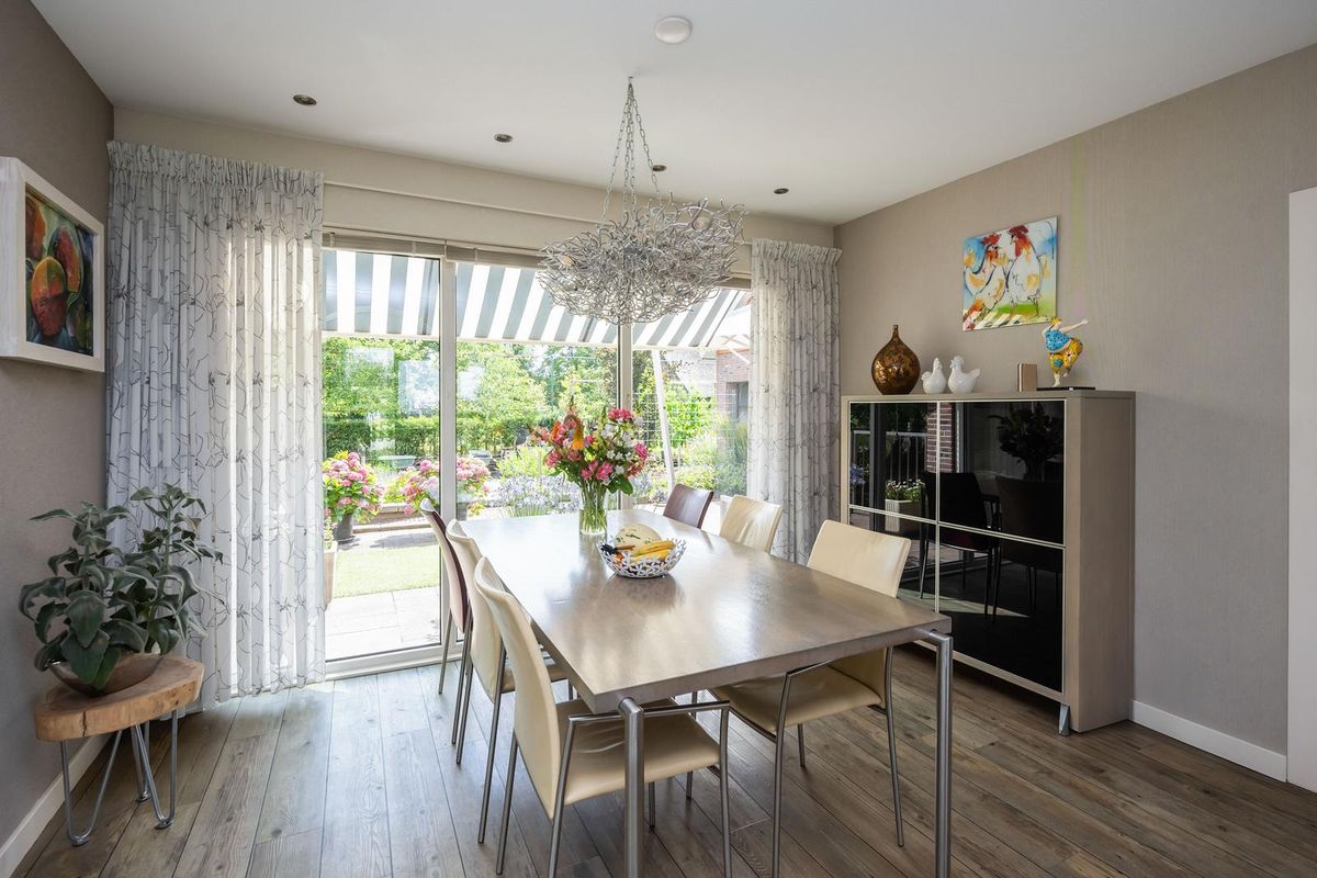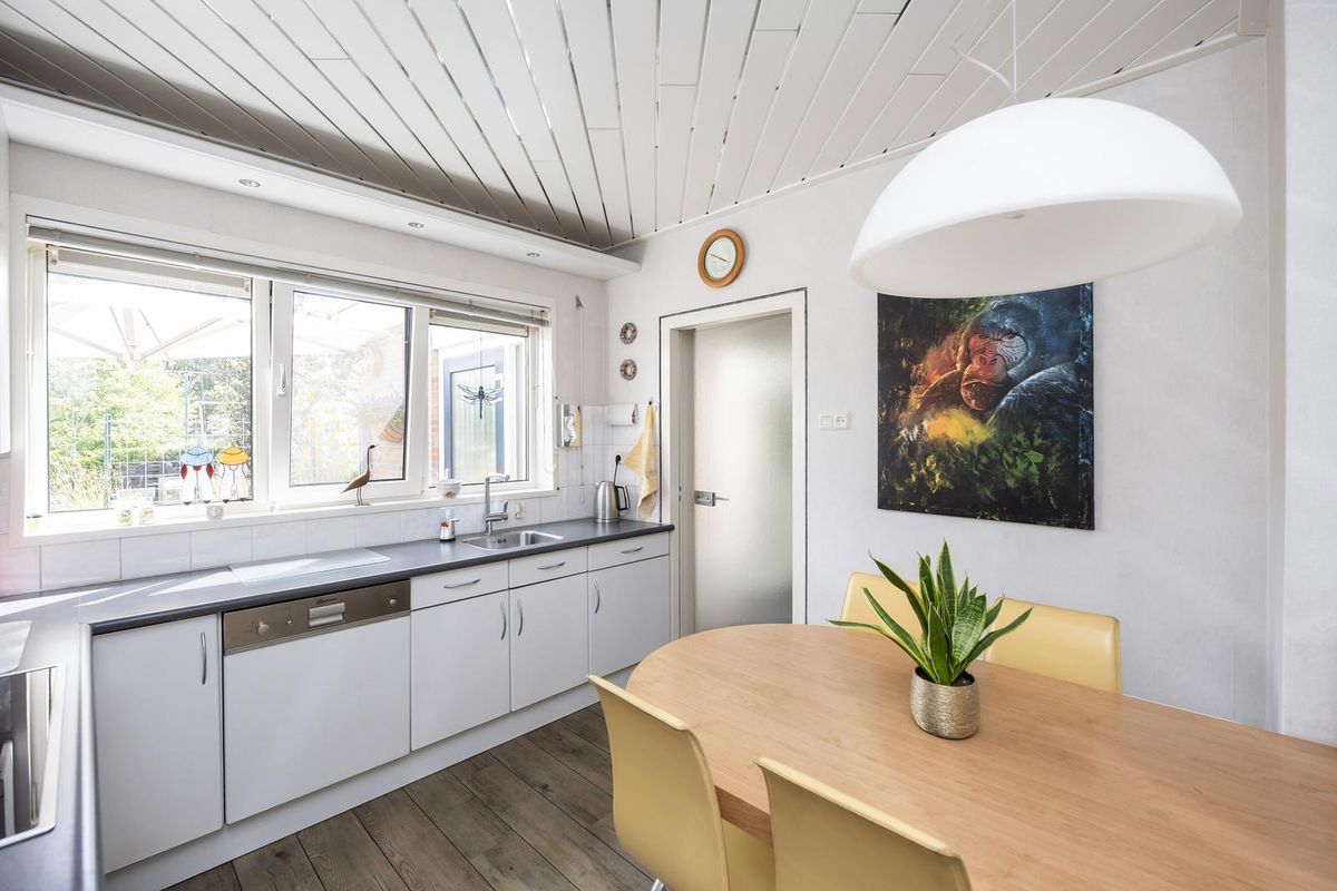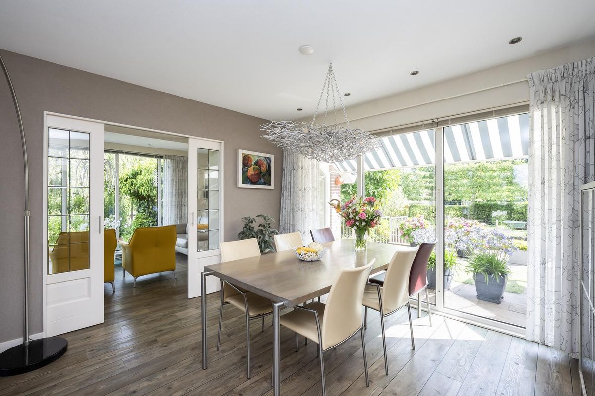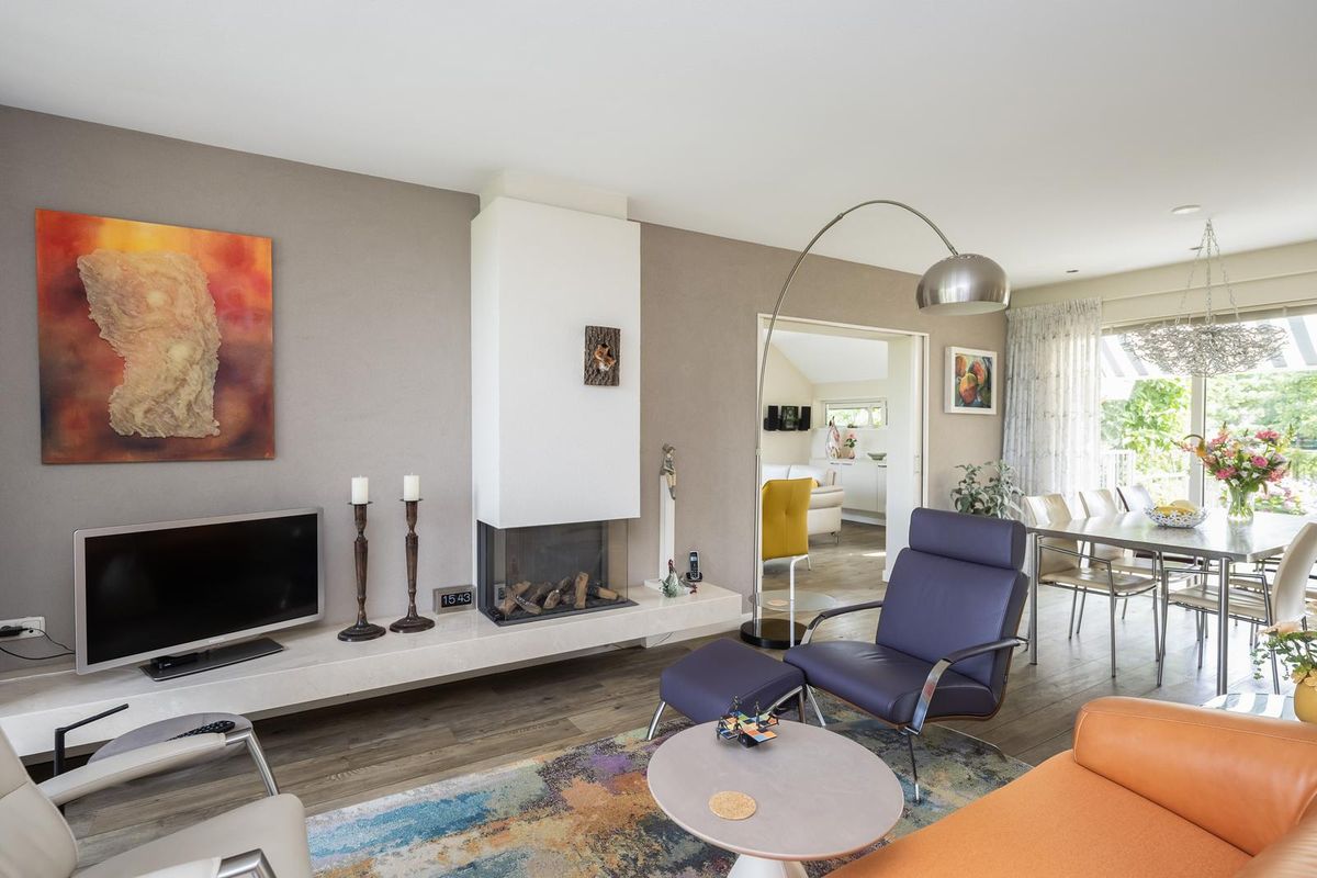 De woonkamer sluit direct aan op de serre, die later is aangebouwd. Dankzij de grote raampartijen is dit een heerlijke plek om in elk seizoen te genieten van de omgeving – van de eerste voorjaarszon tot lange zomeravonden of juist knusse winterdagen.