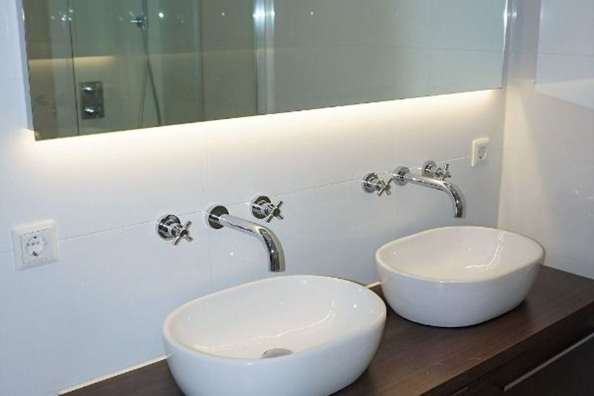 De moderne badkamer met his en hers wastafels en de riante douchehoek met dubbele stort douche.