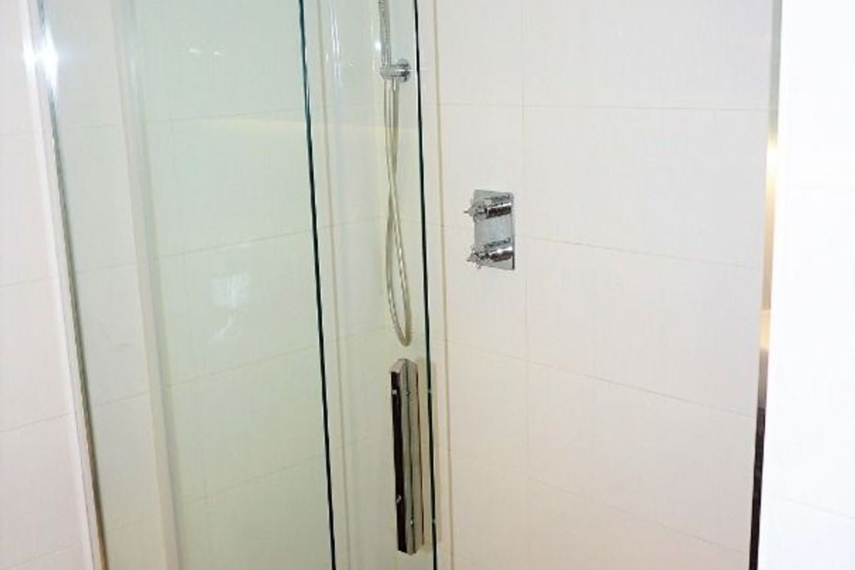 The modern bathroom with his and hers washbasins and the spacious double shower.