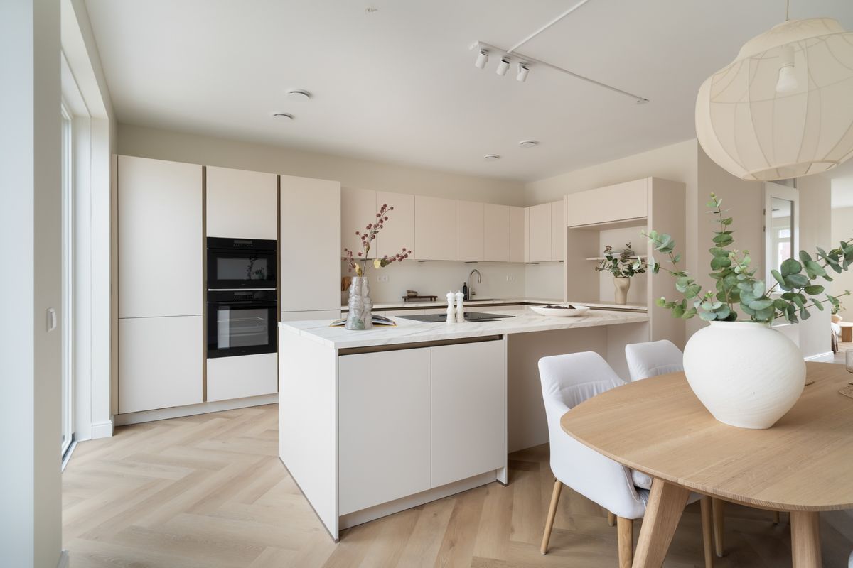 Hier draait alles om samenzijn en genieten. Dat merk je meteen aan de keuken, die praktische gemakken combineert met een prettige, lichte uitstraling. Terwijl jij een maaltijd bereidt, kunnen vrienden of familie plaatsnemen aan de bar. De keuken beschikt over een BORA inductiekookplaat met geïntegreerde afzuiging, een Quooker voor direct kokend water, een ruime koelkast en vriezer, en een vaatwasser. Zo wordt koken eenvoudig en gezellig.