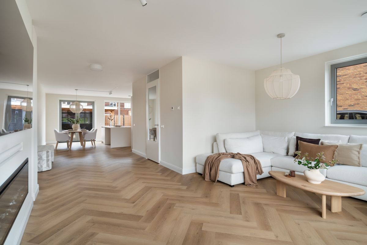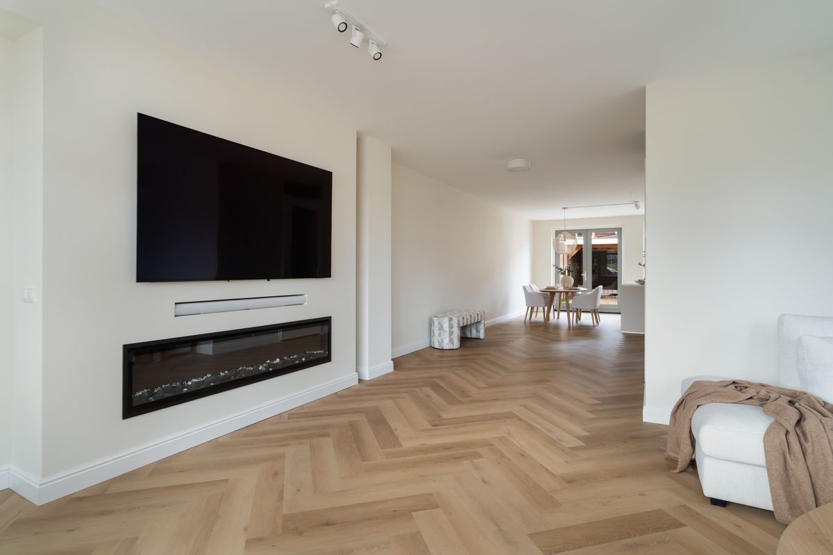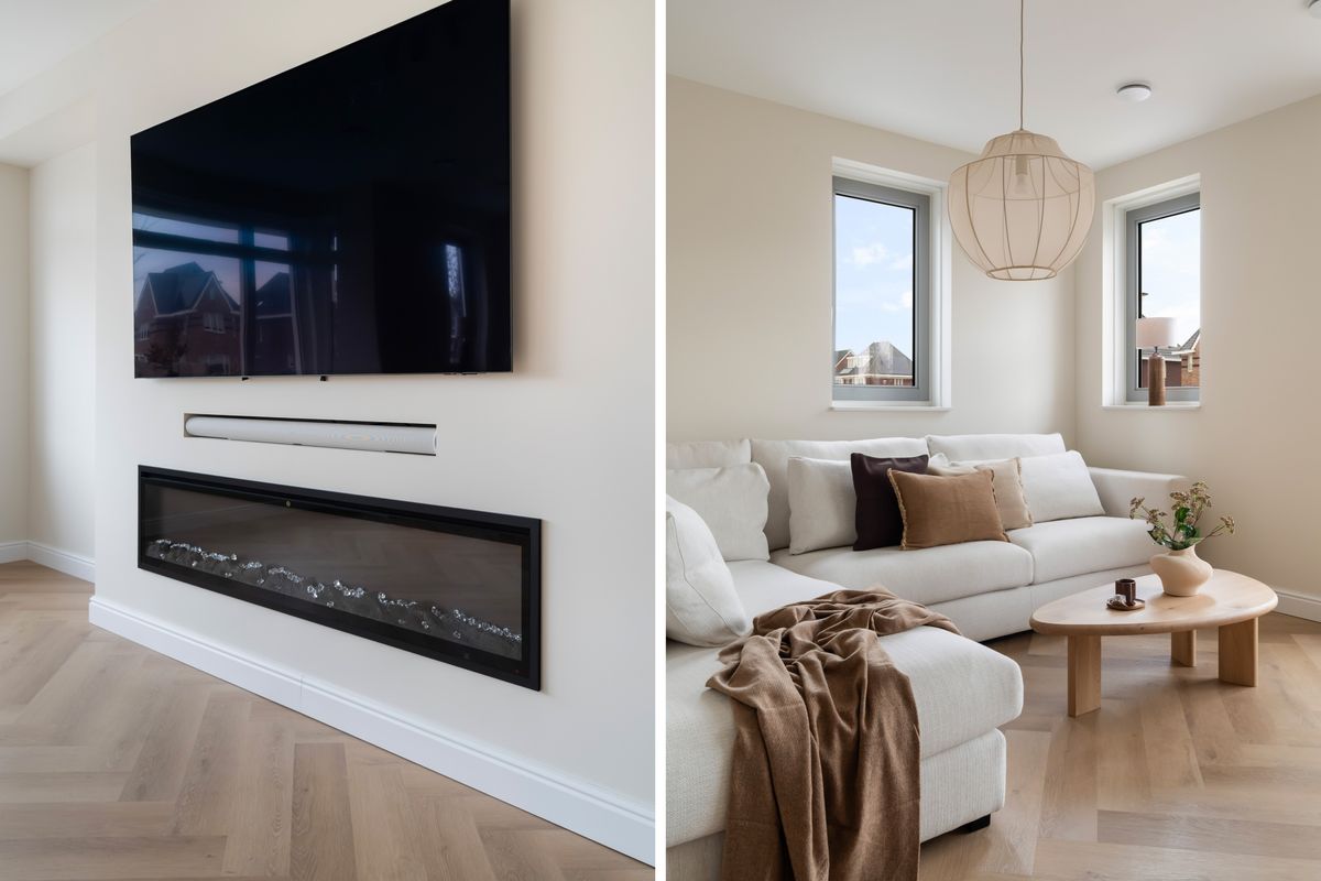 Terug in de woning leidt de open verbinding van de keuken je naar de woonkamer. Hier vormt de cinemawall het hart van de ruimte, compleet mét elektrische openhaard voor knusse winteravonden. Grote ramen zorgen voor volop lichtinval en een ruimtelijk gevoel, terwijl de vloerverwarming het geheel comfortabel en uitnodigend maakt.