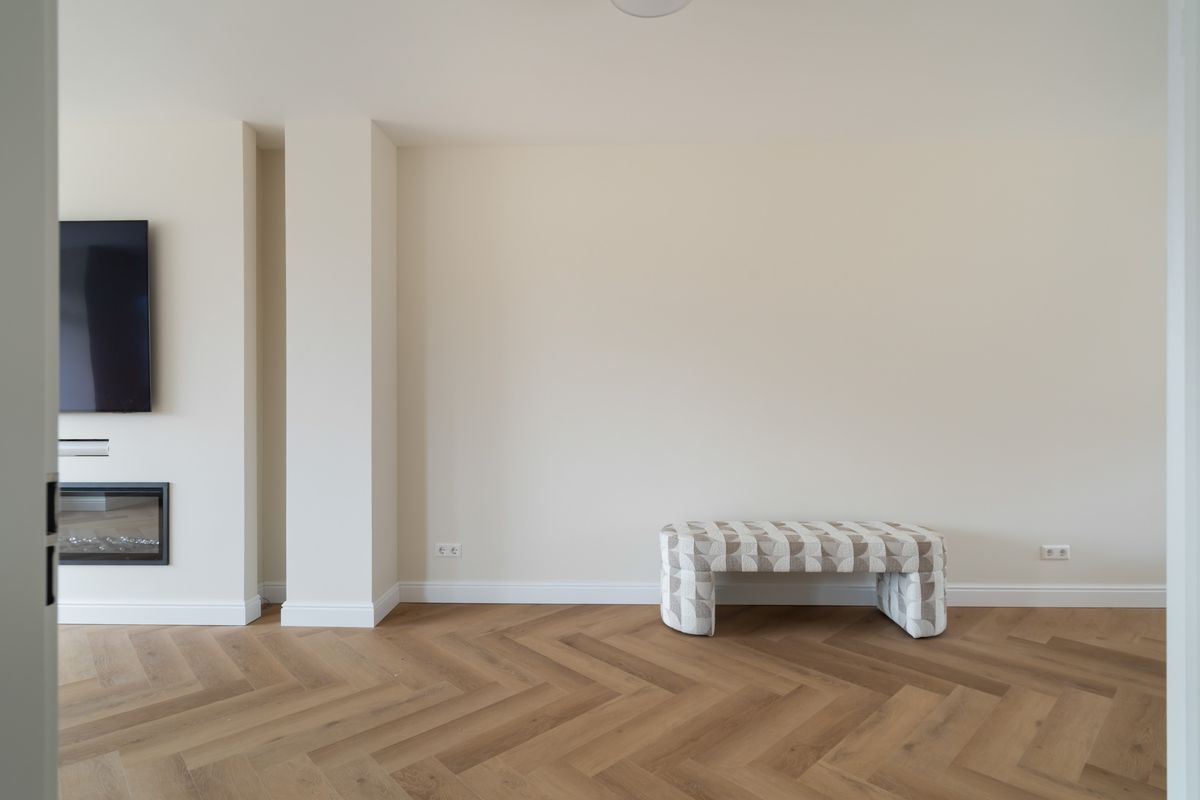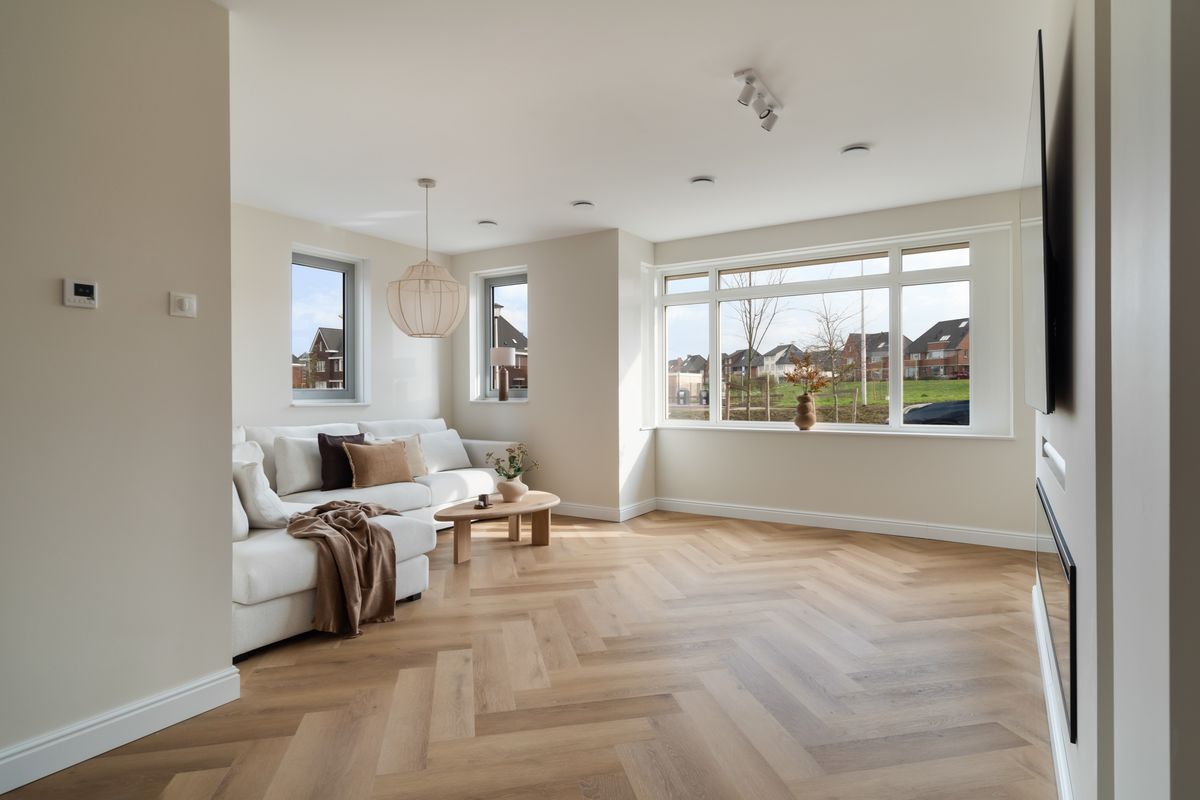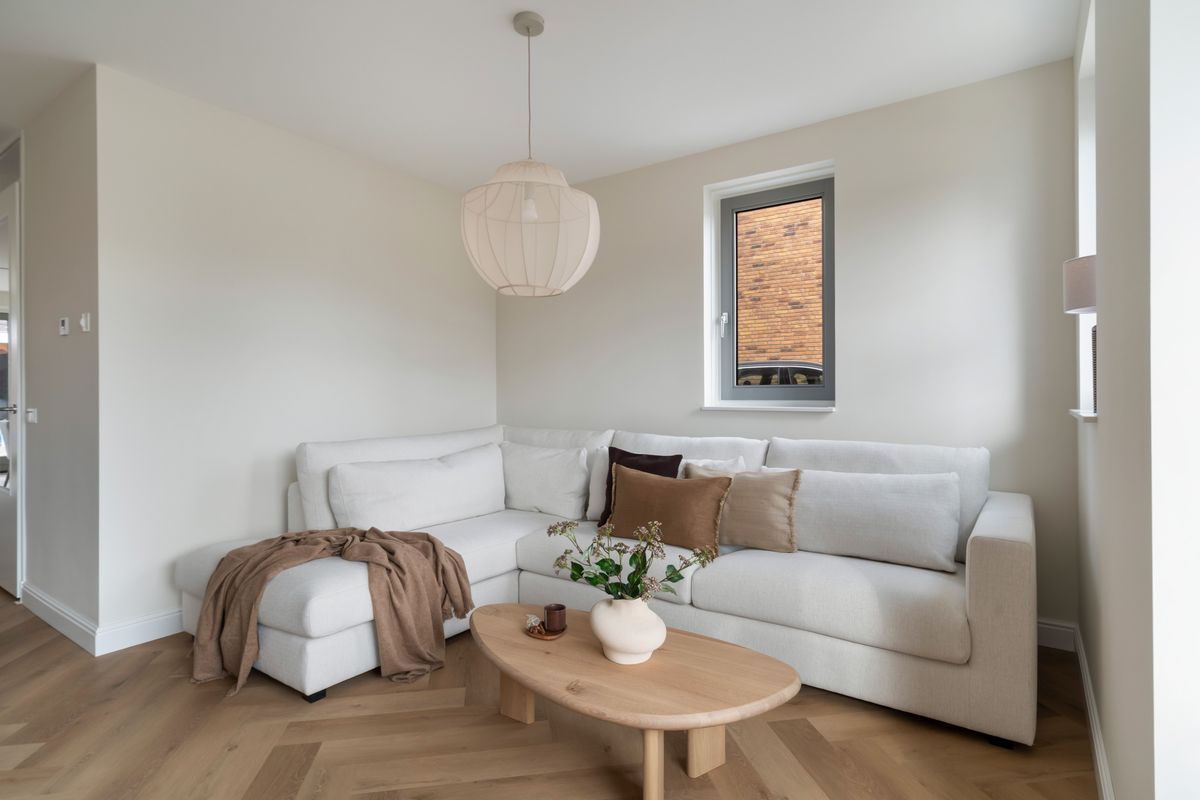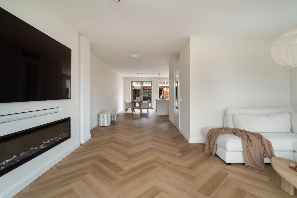 Terug in de woning leidt de open verbinding van de keuken je naar de woonkamer. Hier vormt de cinemawall het hart van de ruimte, compleet mét elektrische openhaard voor knusse winteravonden. Grote ramen zorgen voor volop lichtinval en een ruimtelijk gevoel, terwijl de vloerverwarming het geheel comfortabel en uitnodigend maakt.