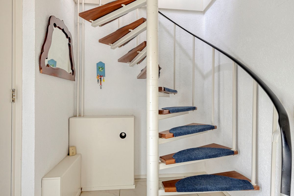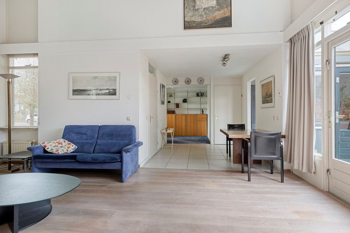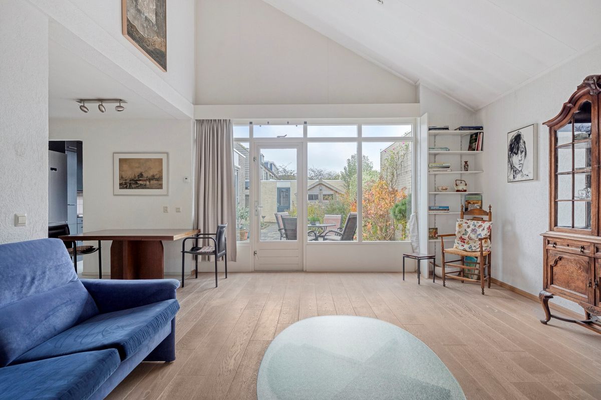 Entrance with an awning, hall with the meter cupboard and spiral staircase to the first floor. Bright and high-ceilinged living/dining room (with the possibility of creating a loft or additional bedroom in the ridge) with underfloor heating, wooden flooring, and large windows at the rear with access to the back garden. An additional (bed)room with sliding doors at the front is currently used as a study. Walk through to the kitchen with various built-in appliances and a door to the back garden. Access to the hall with a separate wall-hung toilet with a hand basin, a separate laundry room, and a spacious bathroom tiled to the ceiling with a walk-in shower and double vanity with mirrored lighting. At the rear is the spacious and bright master bedroom with a walk-in closet and views and access to the lovely garden.