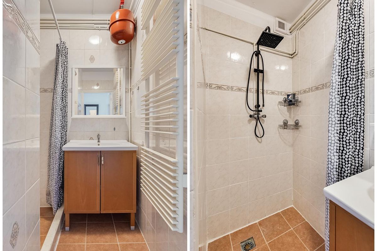Badkamer (ca. 3 m2) met sanitaire voorzieningen zoals een wastafel met wastafelmeubel, spiegel, designradiator en een inloopdouche. De badkamer is geheel betegeld in een lichte kleurstelling.