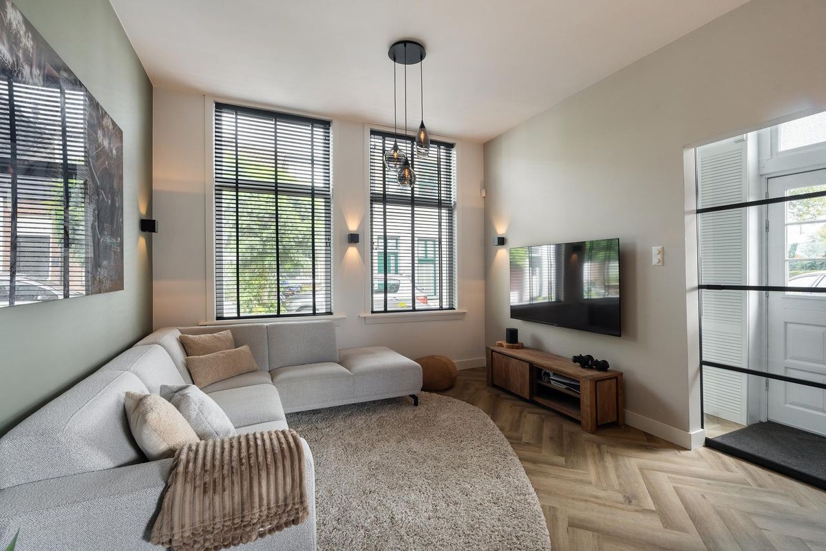 Via de entree met meterkast en modern toilet (voorzien van hangend closet en fontein) komt u in de lichte woonkamer aan de voorzijde van de woning. De hoge ramen en de royale plafondhoogte zorgen voor een aangename lichtinval en een ruimtelijk gevoel. Aan de achterzijde bevindt zich de keuken, die is uitgerust met diverse inbouwapparatuur, waaronder een inductiekookplaat met afzuigsysteem, oven, vaatwasser en koelkast. Aangrenzend ligt de praktische bijkeuken met aansluitingen voor wasmachine en droger en extra bergruimte.