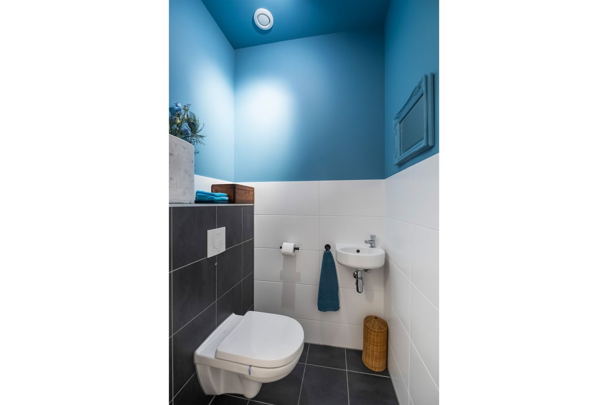 De badkamer is zowel vanuit de hal als vanuit de grootste slaapkamer bereikbaar en voorzien van een douche, extra toilet en wastafel.