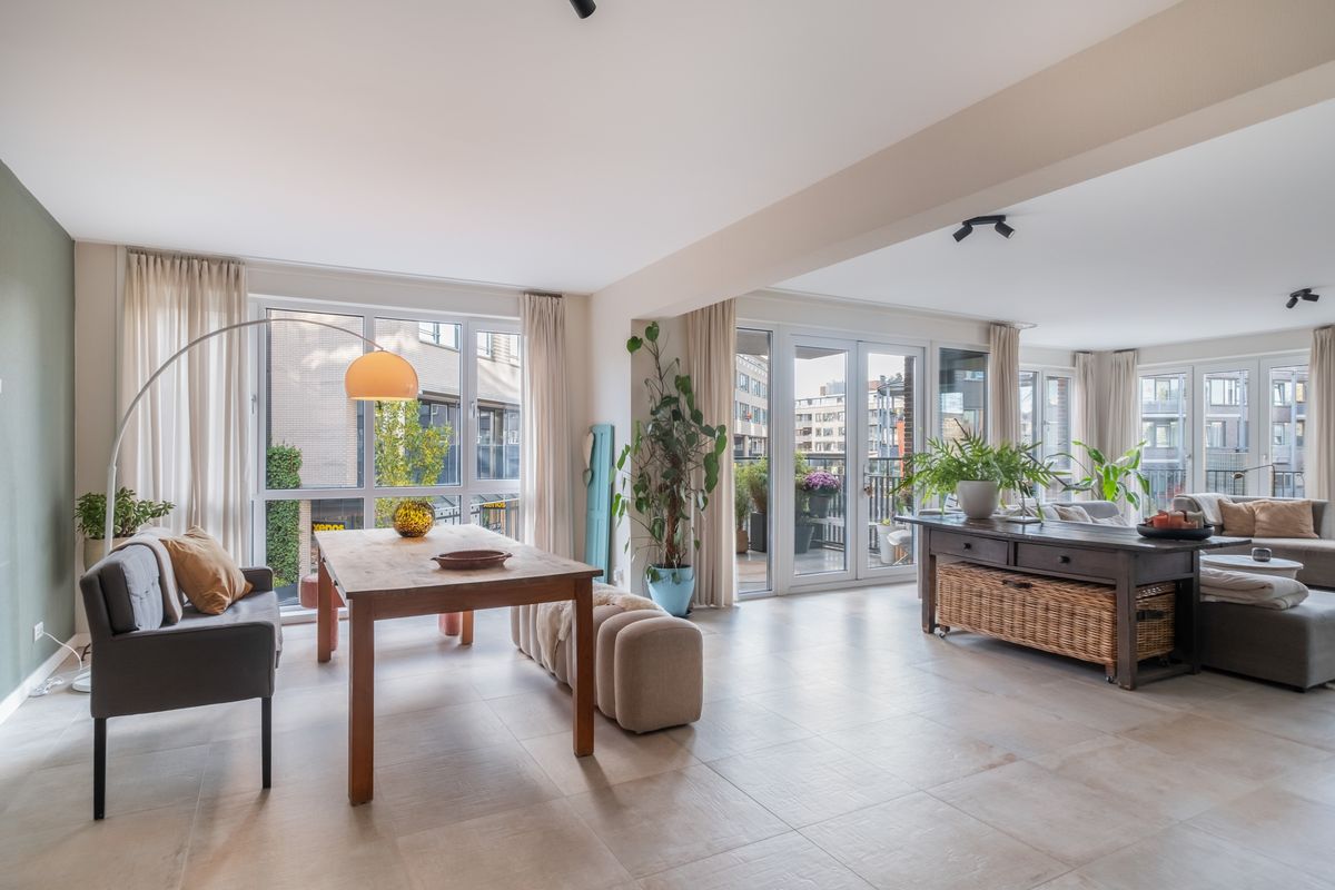 Grenzend aan de keuken is ruimte voor een grote eettafel voor acht personen. Via dubbele openslaande deuren bereikt u het terras, wat het appartement een gevoel van grandeur en licht geeft.
