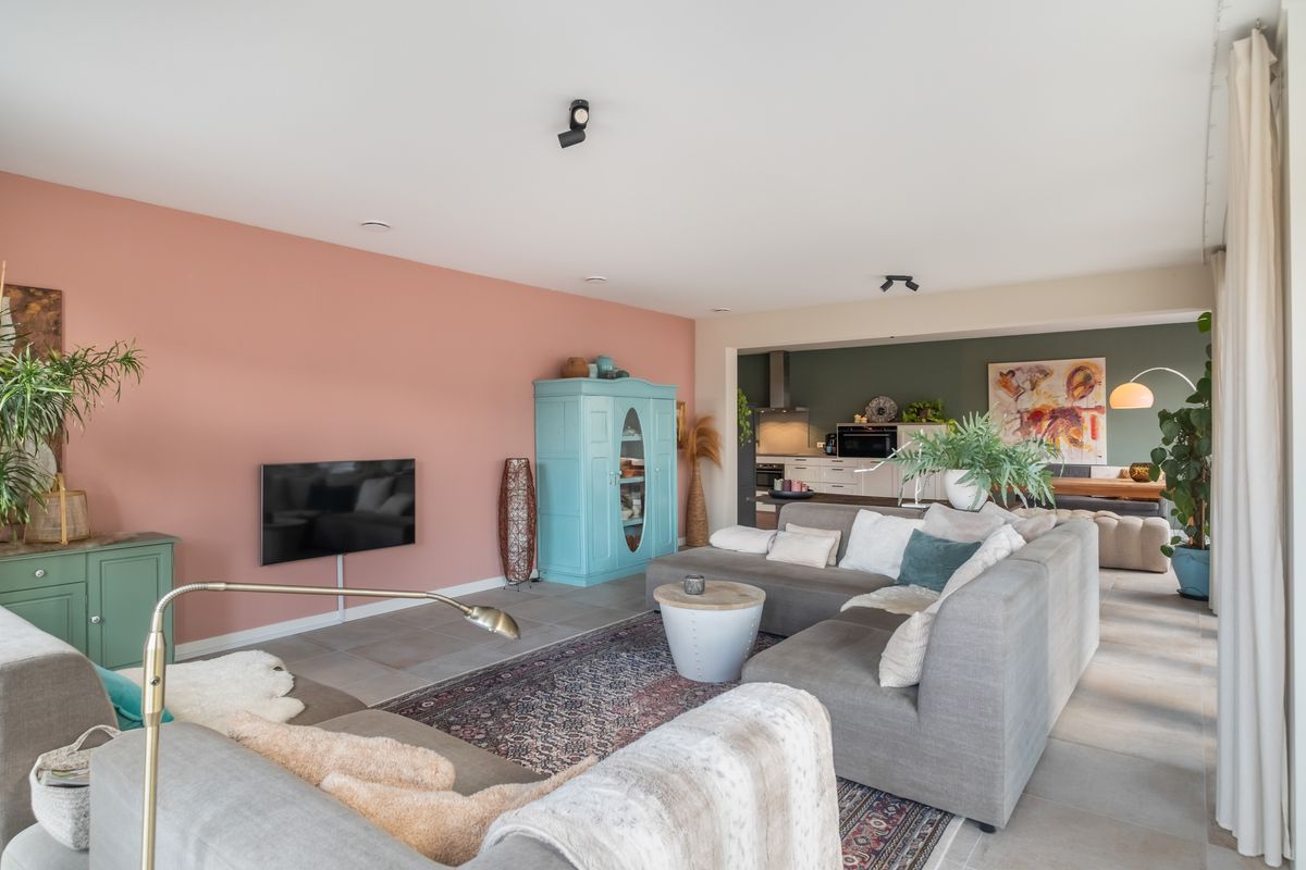 De ruime woonkamer met kozijnen die lopen tot aan de vloer, waardoor u vanuit elke hoek kunt genieten van een uniek, ruimtelijk uitzicht.
