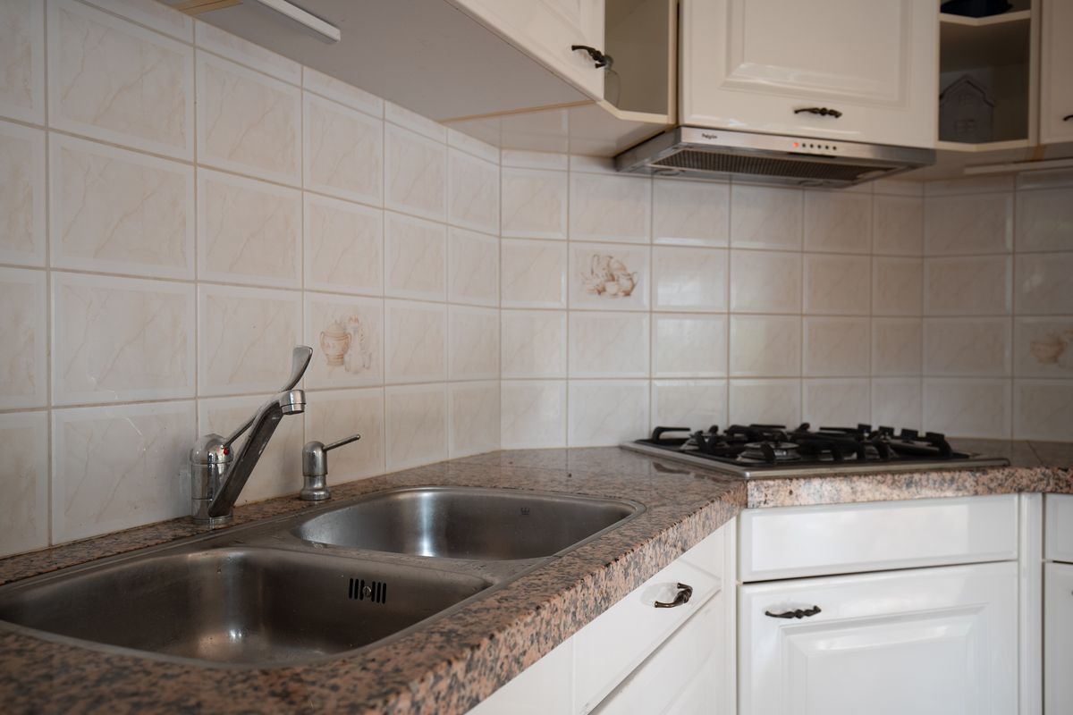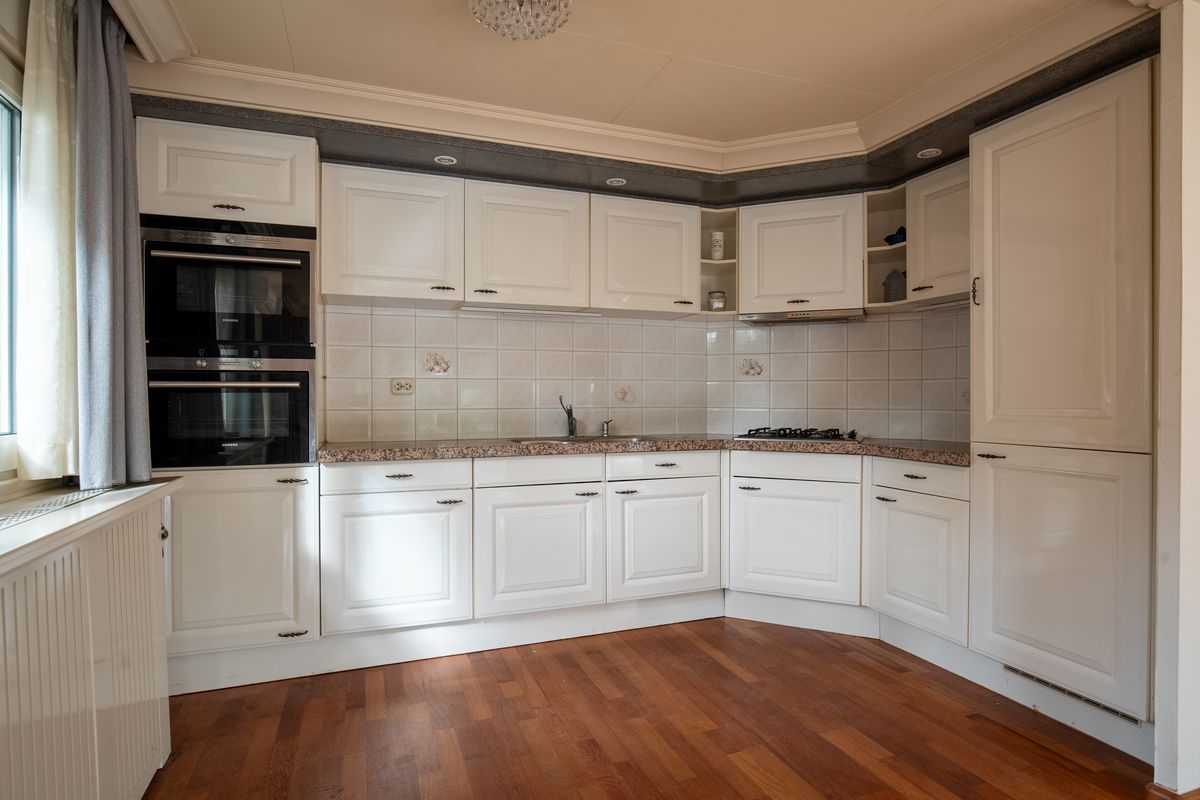 Open keuken met o.a. een koel-vriescombi, vaatwasser, oven, gaskookplaat en afzuigkap