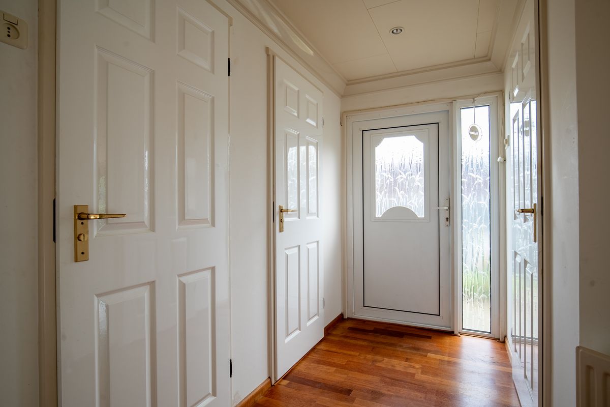 De zonnige tuin rondom de woning is netjes aangelegd, makkelijk te onderhouden en biedt altijd wel een plekje in de zon. Aan de woning grenst een ruim terras. In de schuur is ruimte voor fietsen en vind je aansluitingen voor wasmachine en droger.
