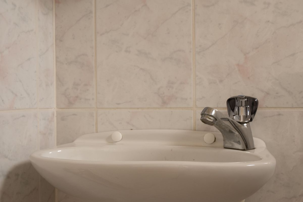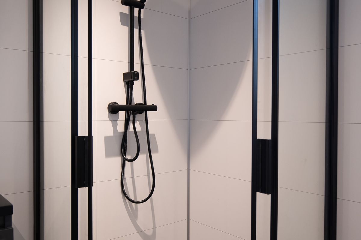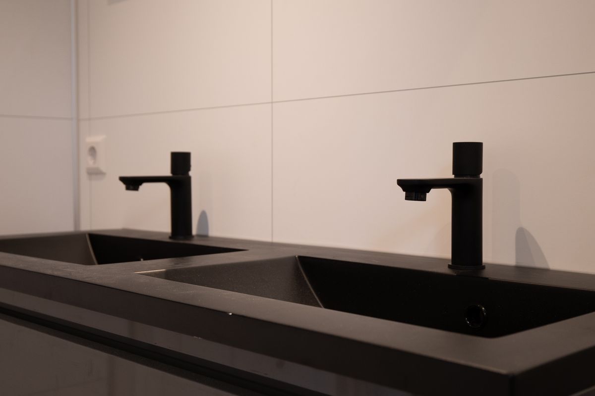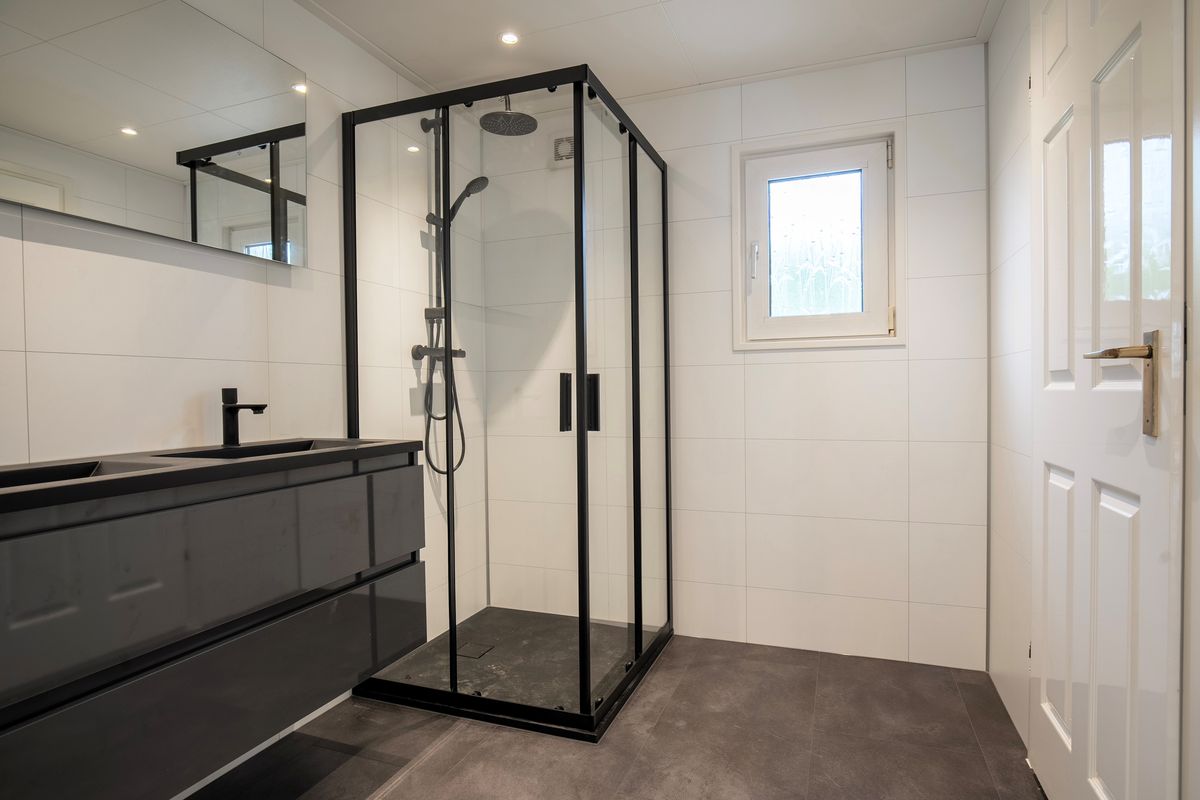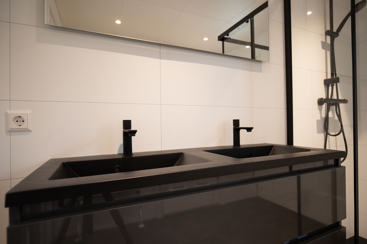 Nieuwe moderne badkamer met douche, dubbele wastafel en handdoekradiator