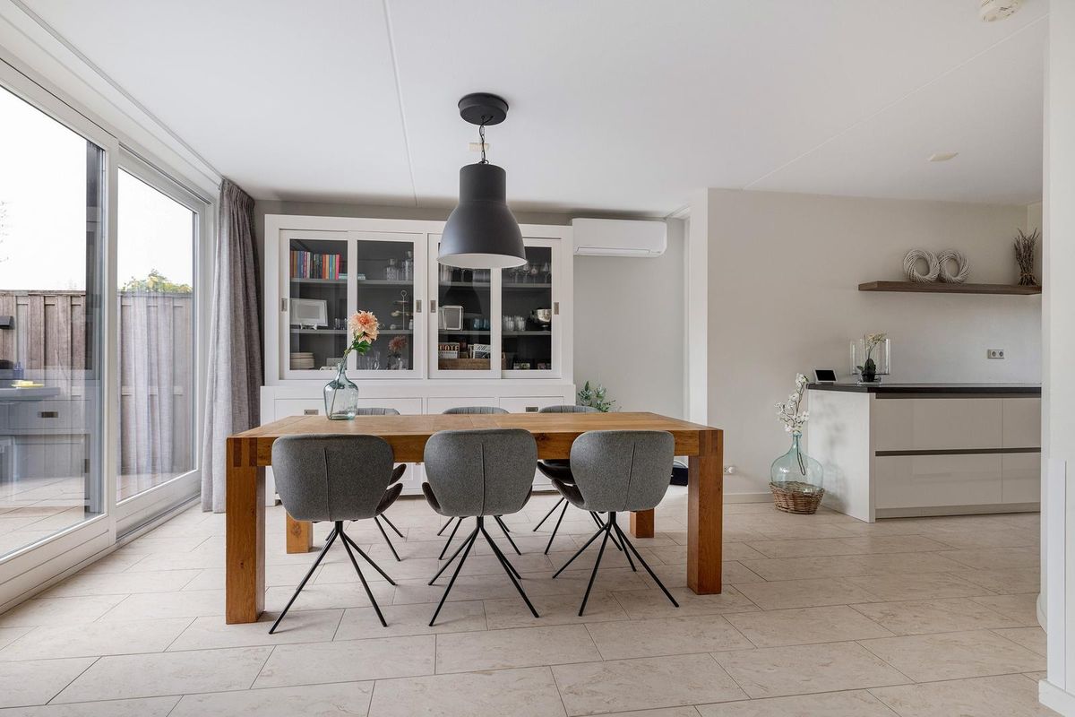 Het eetgedeelte grenst aan de schuifpui naar de tuin (voorzien van elektrisch rolluik), ideaal voor lange zomeravonden. De halfopen keuken aan de voorzijde is luxe uitgevoerd in wit hoogglans met een donkergrijs composiet werkblad. De keuken is voorzien van hoogwaardige inbouwapparatuur, waaronder een combi-oven, koel-vriescombinatie, vaatwasser, 5-pits inductiekookplaat met geïntegreerde afzuigkap, Quooker-kraan, apothekerskast en praktische LeMans-carrouselkast.