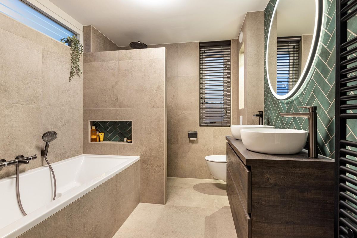 De tweede badkamer is volledig betegeld in wit/beige tinten en voorzien van een inloopdouche, wastafelmeubel met spiegelkast en hangend toilet – perfect voor gezinnen of gasten.