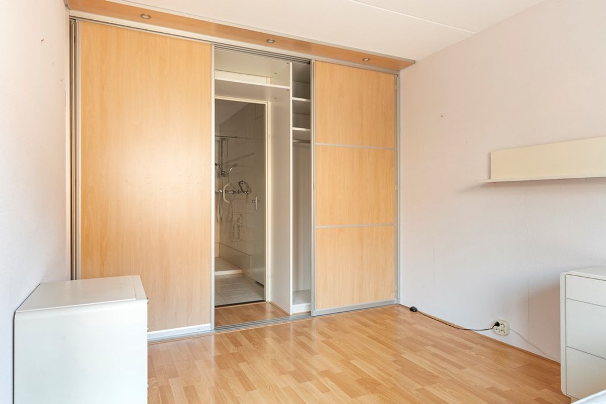 Ruime slaapkamer met kastenwand en directe toegang tot de badkamer.
