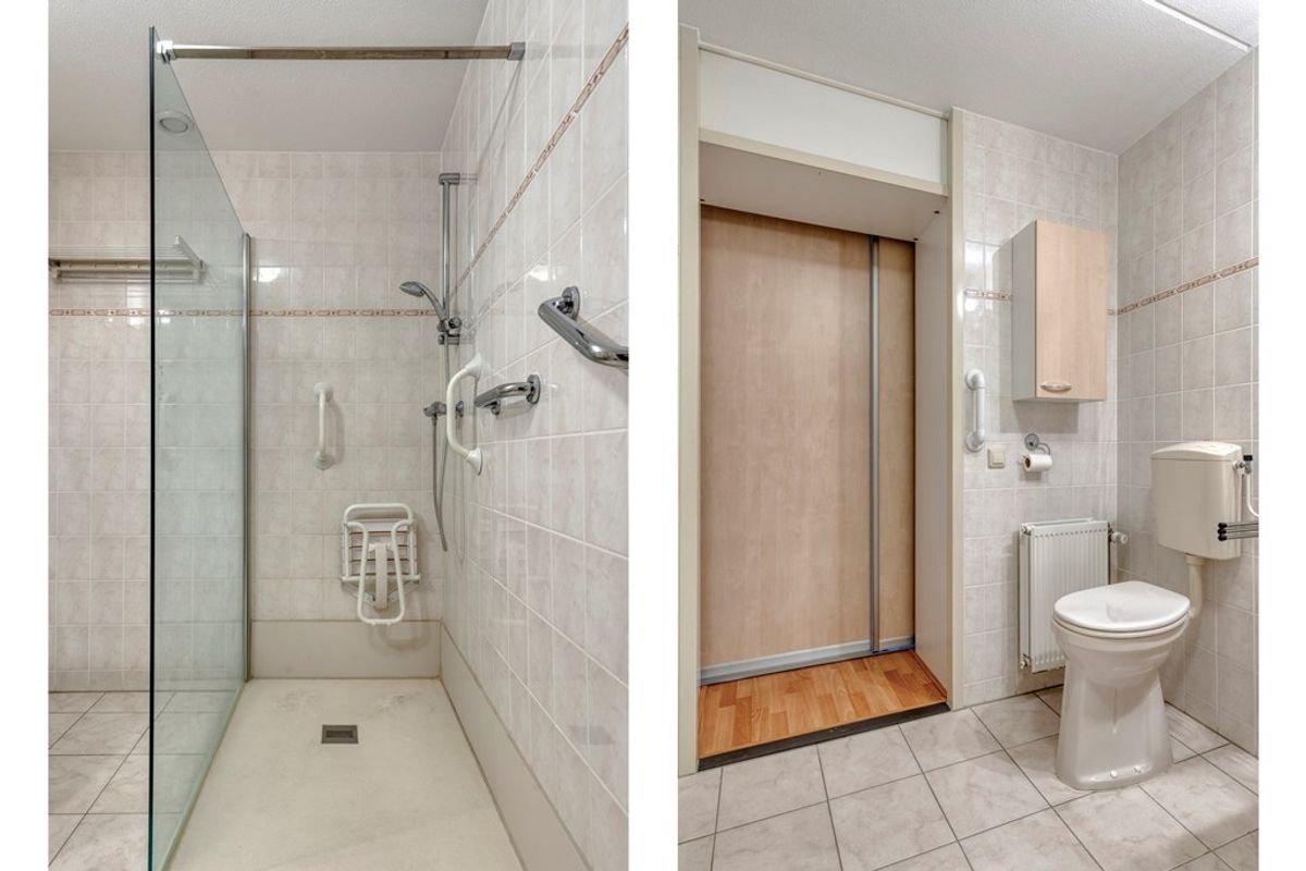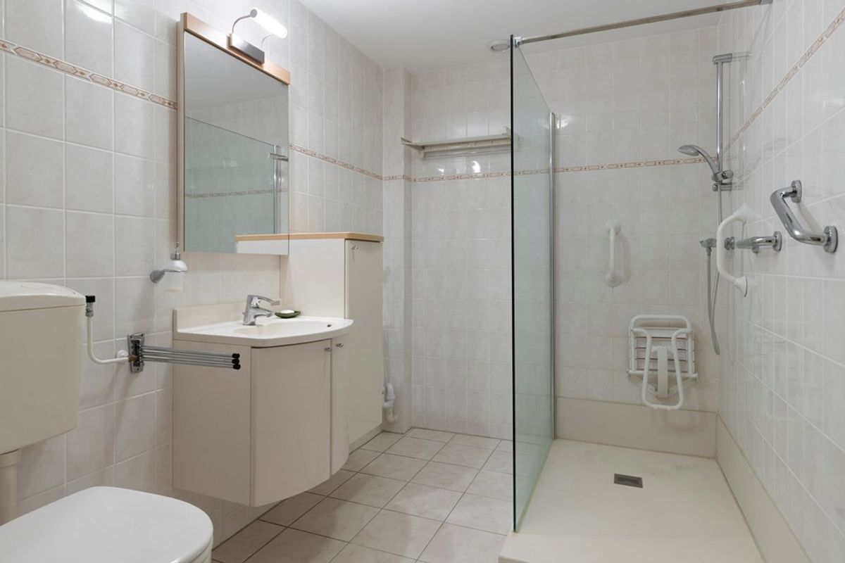 Keurig verzorgde badkamer met inloopdouche, toilet en wastafelmeubel. Ook is hier de aansluiting voor de wasmachine.