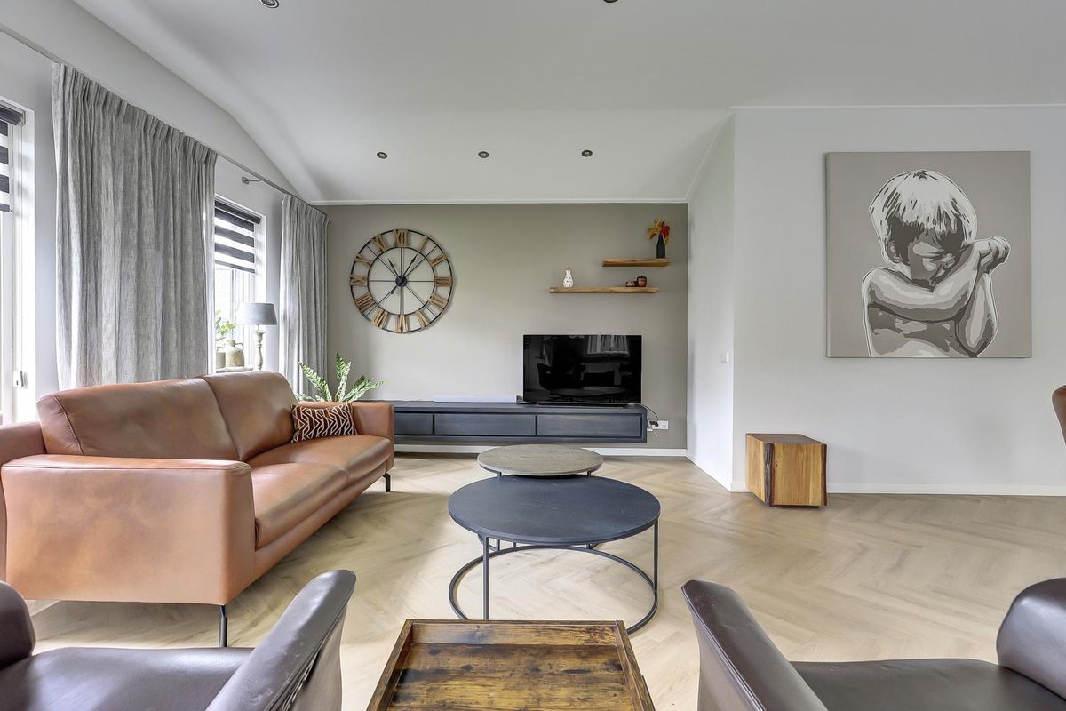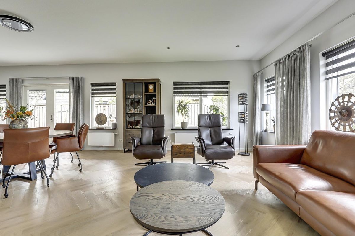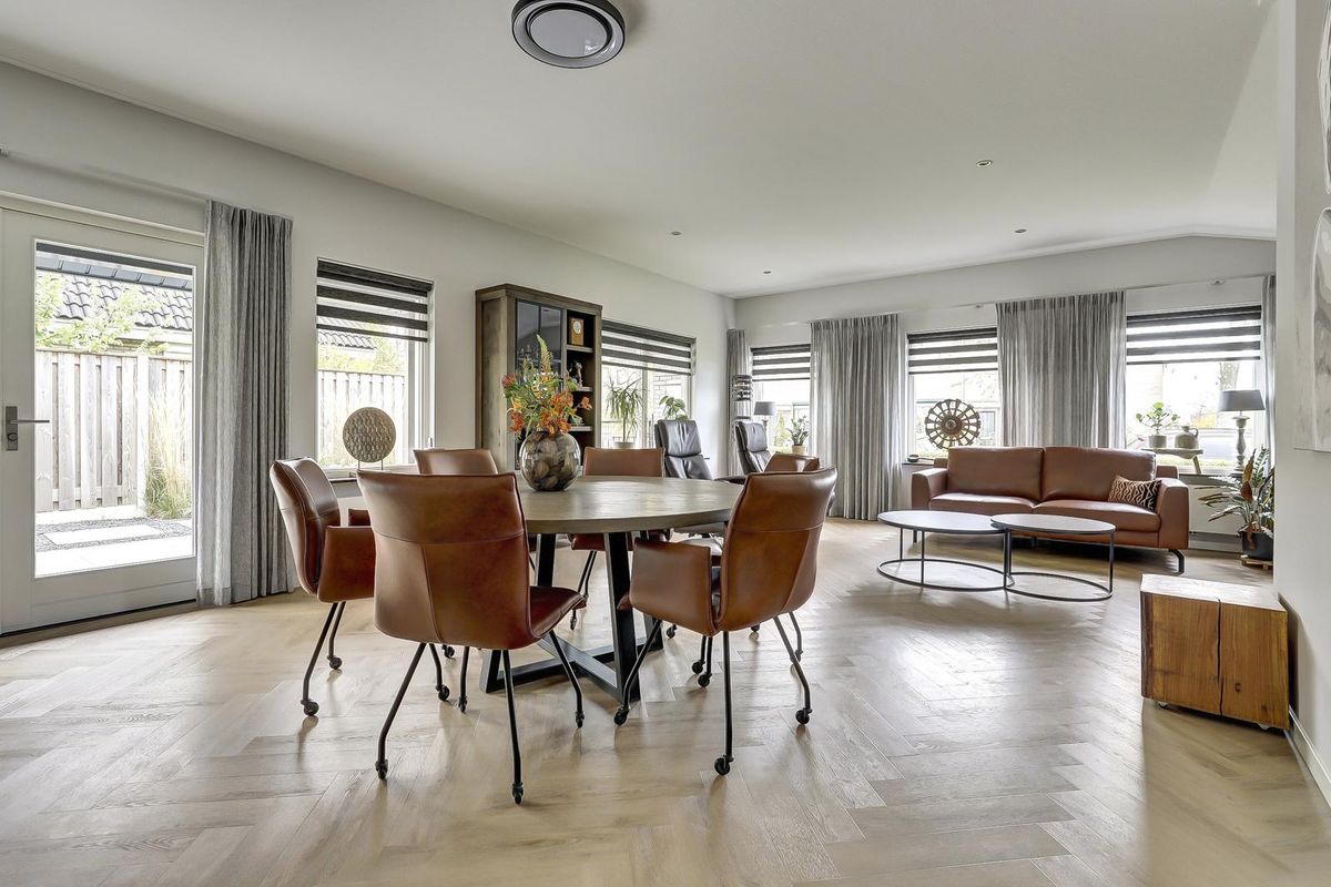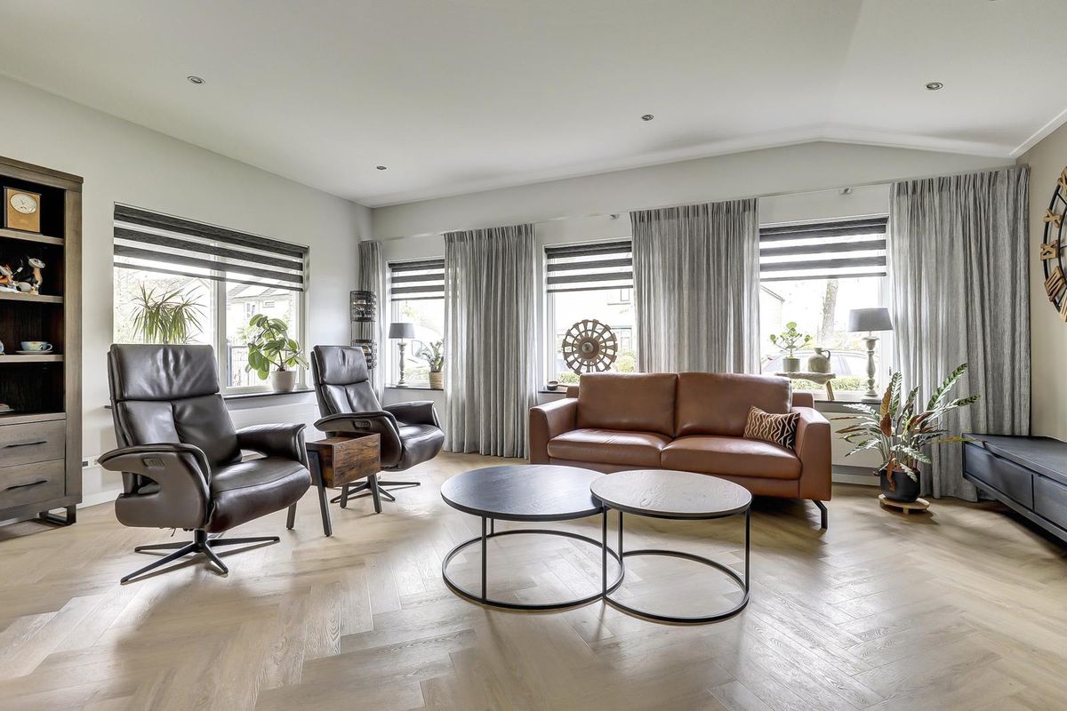 De woonkamer is een echte eyecatcher. Dankzij de vele ramen stroomt het daglicht rijkelijk naar binnen, waardoor de ruimte een heerlijke, open sfeer heeft. De fraaie visgraat PVC-vloer, strakke afwerking en rustige tinten zorgen voor een stijlvolle en warme uitstraling. Er is meer dan genoeg ruimte voor een royale zithoek en een knusse lees- of werkplek bij het raam.